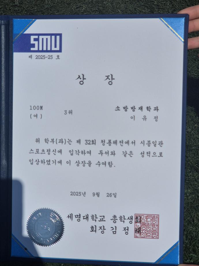 본문 시작 홈으로 커뮤니티 학과소개 교수소개 전공과정 커뮤니티 홈페이지가이드 학과행사 학과공지 채용정보 학사일정 학과행사 동아리 소방방재학과의 자랑 궁금합니다 수험생 Q&A 학과행사 페이스북 트위터 프린트 2025학년도 제32회 청룡체전 소방방재학과 소방방재학과 530 2025-09-23 2025년 9월 23일 ~9월 25일 제32회 청룡체전 기간동안 여자 피구, 남자 축구, 남자 농구, 혼성 계주, 여자 100m, 남자 100m 참가하였습니다. 선수분들 모두 수고하셨고, 응원해주신 학우분들 감사드립니다! 목록 이전KICT 화재안전연구소 견학 담당부서 : 소방방재학과 담당자 : - 연락처 : 043-649-1787 최종수정일 : 2024-10-26 만족도조사 만족도 조사 이 페이지에서 제공하는 정보에 대하여 만족하시나요? 매우만족 만족 보통 불만족 매우불만족