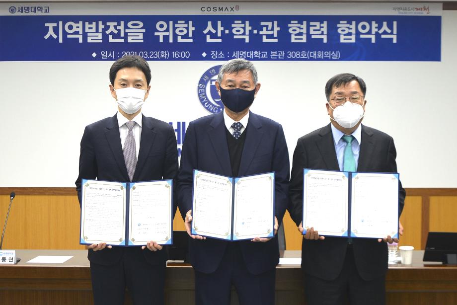 세명대학교(총장직무대행 권동현)와 제천시(시장 이상천)가 코스맥스그룹(회장 이경수)과 3월 23일 오후 4시 세명대 본관 대회의실에서 산·학·관 협약을 체결했다.