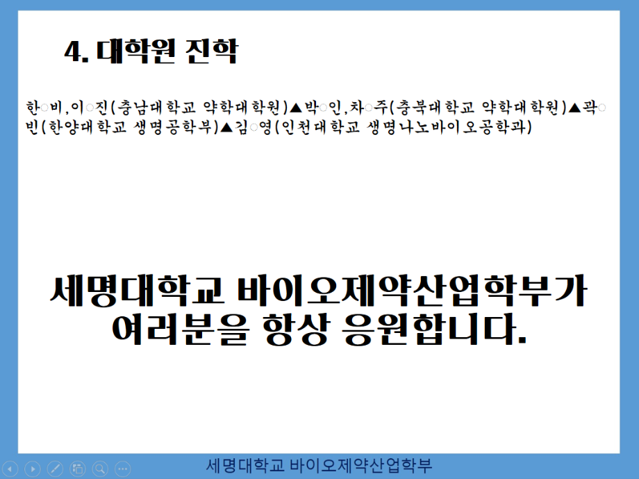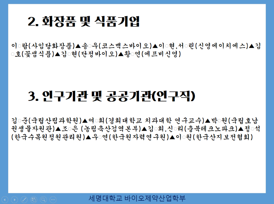 본문 시작 홈으로 학부자료실 학부소개 교육과정 학부공지게시판 학부자료실 홈페이지가이드 학부행사 및 사진게시판 학부행사 및 사진게시판 학생회 소개 학부행사 및 사진게시판 페이스북 트위터 프린트 바이오제약산업학부 취업자 현황 바이오제약산업학부 3277 2023-09-10 바이오제약산업학부 취업자 현황 본인이 공개하기를 동의하지 않은 경우를 제외하고 취업현황을 공지하니 착오없으시기 바랍니다. 목록 이전이종원박사(강신호교수연구실, 2021) 한국산지보전협회 임용 다음 수시모집 기간안내 2023. 09.11-09.15 담당부서 : 바이오제약산업학부 담당자 : - 연락처 : 043-649-1729 최종수정일 : 2024-10-26 만족도조사 만족도 조사 이 페이지에서 제공하는 정보에 대하여 만족하시나요? 매우만족 만족 보통 불만족 매우불만족