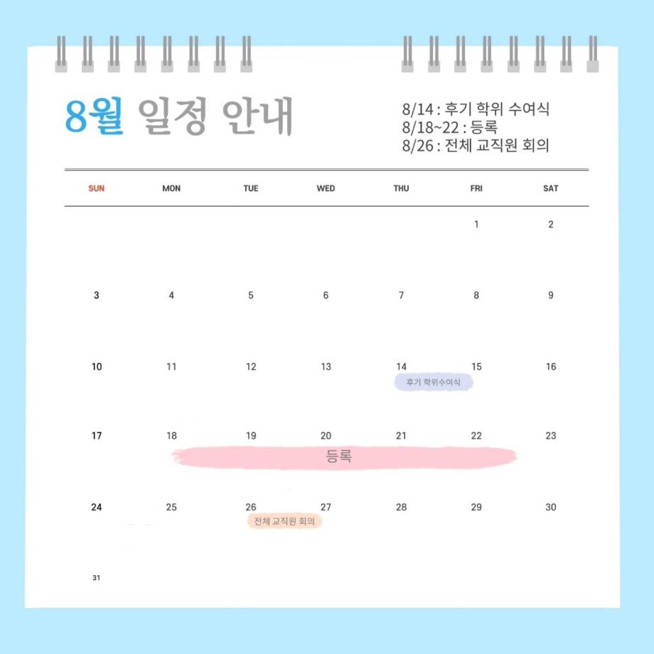 8월은 후기 학위 수여식부터 등록 기간, 전체 교직원 회의가 있습니다