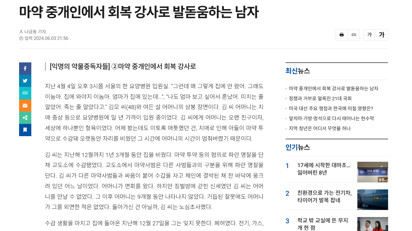 40대 남성 김 모 씨는 16년간 필로폰에 중독돼 있었다. 처음에는 단순 투약자였지만, 시간이 흐르면서 중개인 역할까지 하게 되었다. 다섯 차례 형사 입건됐고, 두 차례에 걸쳐 도합 2년 4개월의 징역형을 살았다. 김 씨의 마약 중독기, 아픈 어머니를 향한 애끓는 사모곡, 회복강사가 되기 위한 여정 등을 살펴본다.