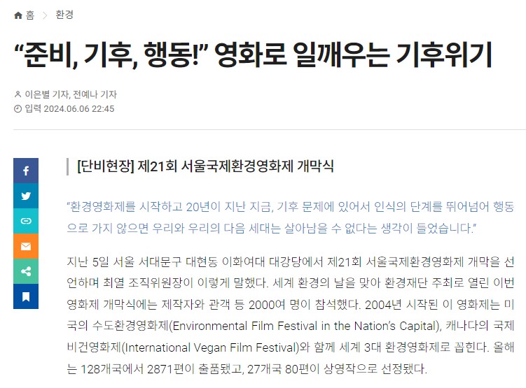 <단비뉴스>가 서울국제환경영화제 개막식 현장을 다녀와 기사에 담았습니다.