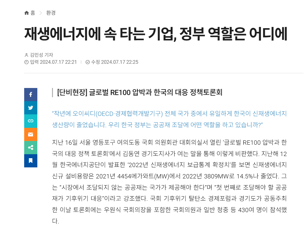 RE100이 글로벌 기업이 달성해야 할 중요한 과제로 떠오르는 가운데 지난 16일 서울 여의도 국회 의원회관 대회의실에서 ‘글로벌 RE100 압박과 한국의 대응 정책 토론회’가 열렸습니다.
