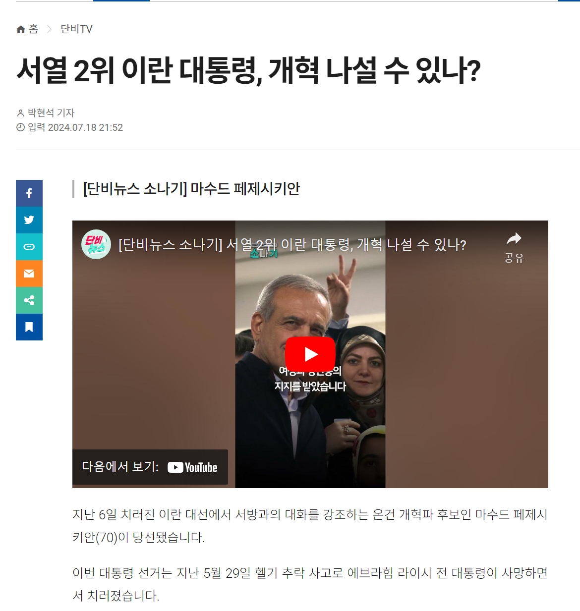 지난 6일 치러진 이란 대선에서 서방과의 대화를 강조하는 온건 개혁파 후보인 마수드 페제시키안(70)이 당선됐습니다.