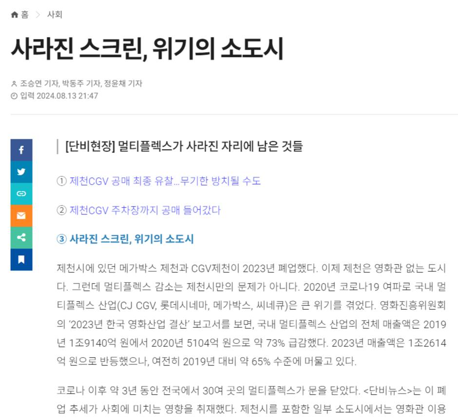 코로나 이후 약 3년 동안 전국에서 30여 곳의 멀티플렉스가 문을 닫았다. <단비뉴스>는 이 폐업 추세가 사회에 미치는 영향을 취재했다. 제천시를 포함한 일부 소도시에서는 영화관 이용이 더욱 어려워졌다. 폐업한 영화관 공간은 다른 용도로 사용되지 않고 방치되어 있다. 영화관이 사라진 지역의 유동 인구가 감소하면서 주변 상권도 위기를 겪고 있다.
