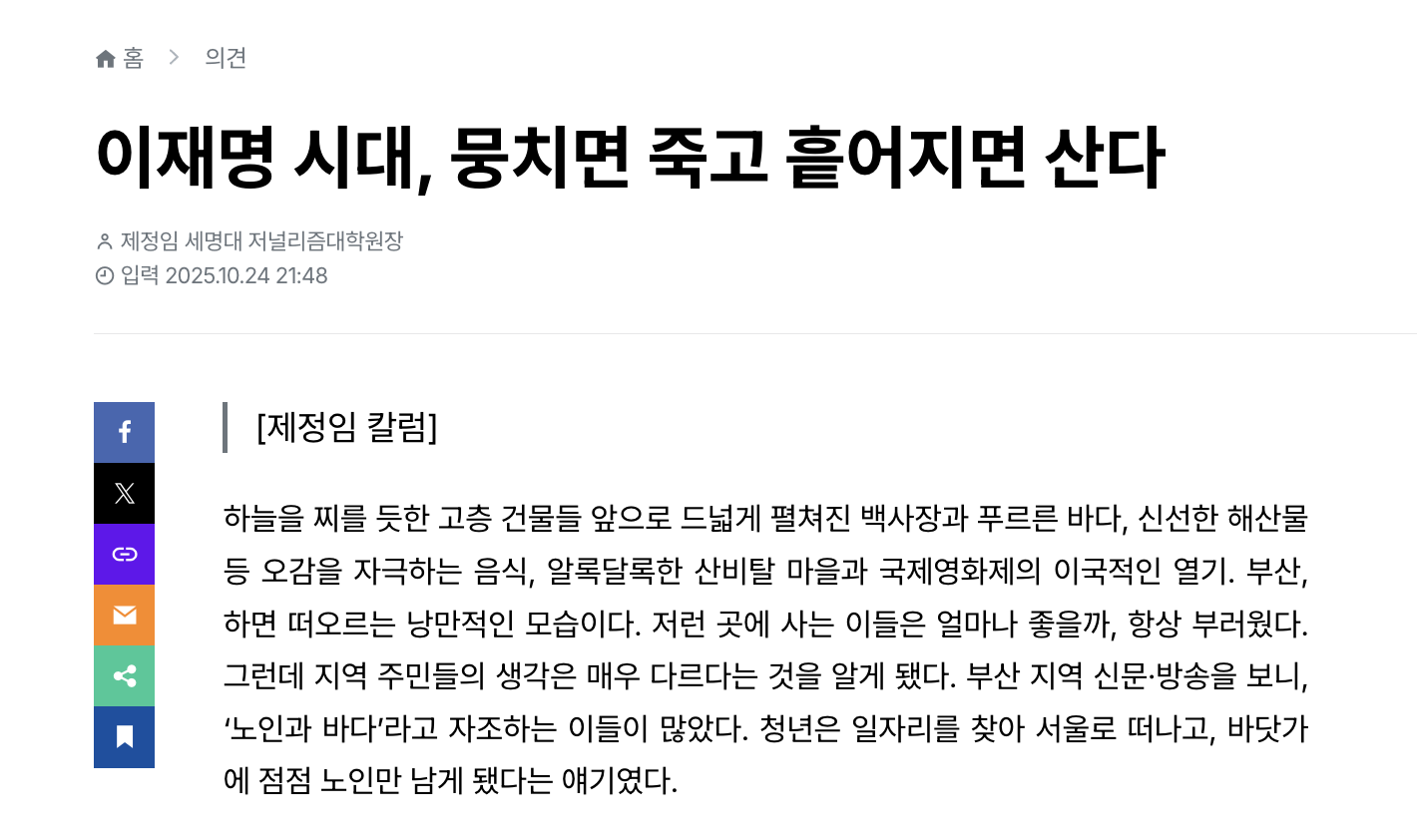 하늘을 찌를 듯한 고층 건물들 앞으로 드넓게 펼쳐진 백사장과 푸르른 바다, 신선한 해산물 등 오감을 자극하는 음식, 알록달록한 산비탈 마을과 국제영화제의 이국적인 열기. 부산, 하면 떠오르는 낭만적인 모습이다. 저런 곳에 사는 이들은 얼마나 좋을까, 항상 부러웠다. 그런데 지역 주민들의 생각은 매우 다르다는 것을 알게 됐다. 부산 지역 신문·방송을 보니, ‘노인과 바다’라고 자조하는 이들이 많았다. 청년은 일자리를 찾아 서울로 떠나고, 바닷가에 점점 노인만 남게 됐다는 얘기였다.