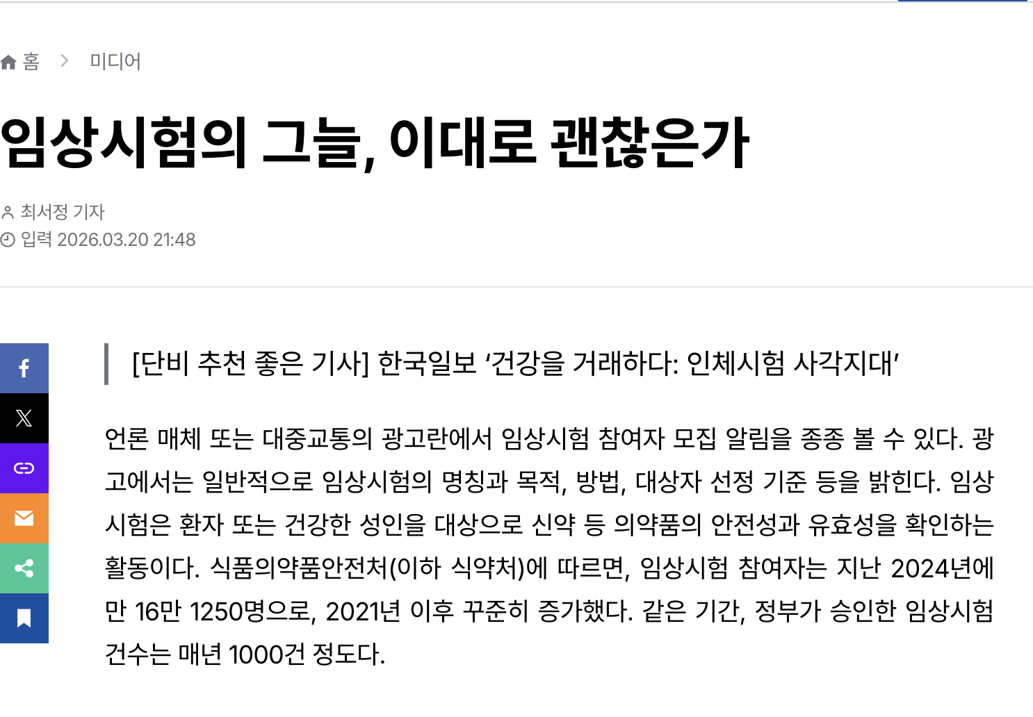 언론 매체 또는 대중교통의 광고란에서 임상시험 참여자 모집 알림을 종종 볼 수 있다. 광고에서는 일반적으로 임상시험의 명칭과 목적, 방법, 대상자 선정 기준 등을 밝힌다. 임상시험은 환자 또는 건강한 성인을 대상으로 신약 등 의약품의 안전성과 유효성을 확인하는 활동이다. 식품의약품안전처(이하 식약처)에 따르면, 임상시험 참여자는 지난 2024년에만 16만 1250명으로, 2021년 이후 꾸준히 증가했다. 같은 기간, 정부가 승인한 임상시험 건수는 매년 1000건 정도다. 임상 과정에서 개인의 건강 혹은 약물 효과에 따라 예상치 못한 부작용이 발생할 수 있다. 심각한 경우 사망에 이를 정도로 위험을 감수하는 일이다. 그런데도 많은 이들이 임상시험에 참여하는 이유는 무엇일까. 누군가는 돈을 벌기 위해, 또 누군가는 더 나은 치료를 받기 위해 임상시험을 선택한다. 부작용은 대개 참여자의 책임으로 남는다.