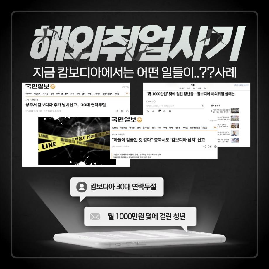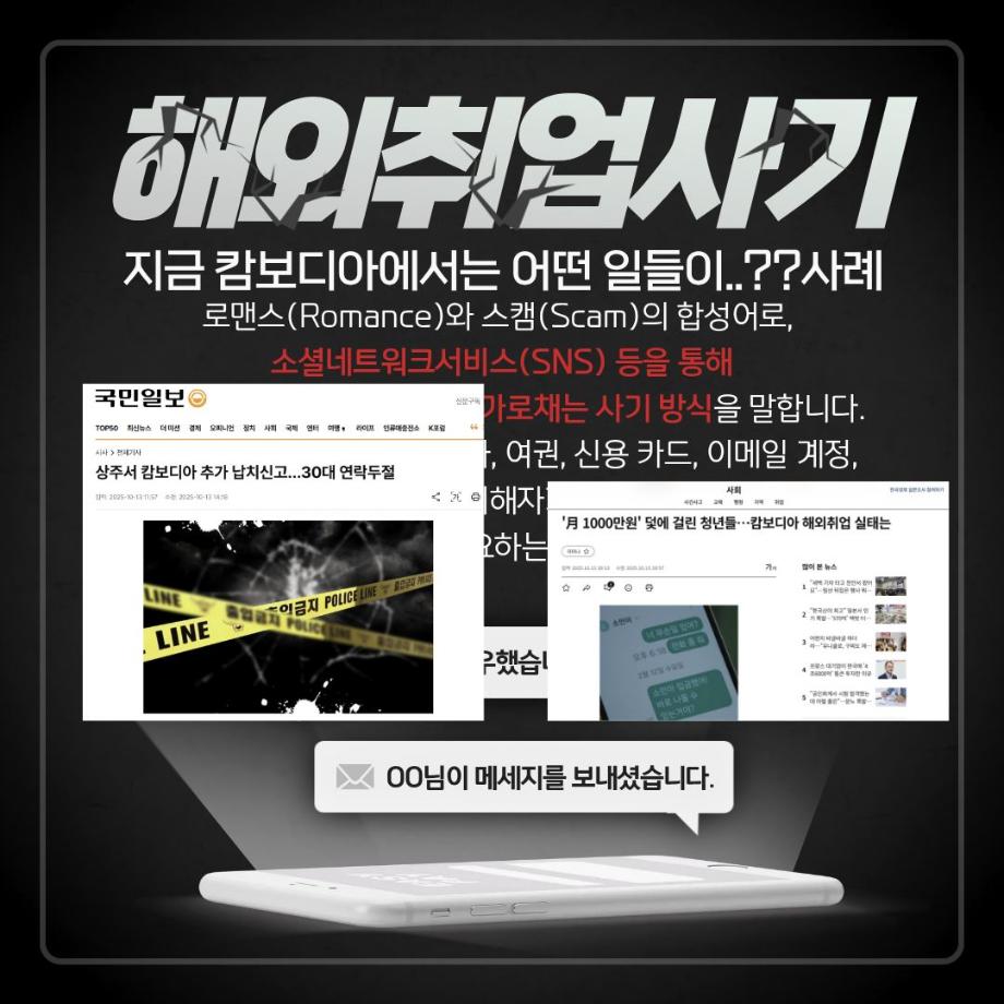 본문 시작 홈으로 커뮤니티 학과소개 교수소개 학과과정 커뮤니티 홈페이지가이드 포토갤러리 학부공지 학과일정 포토갤러리 학생회 동아리 포토갤러리 페이스북 트위터 프린트 해외 취업사기 범죄예방교육 경찰학과 14 2025-10-20 안녕하세요 세명대학교 경찰학과 입니다. 최근 이슈가 되고있는 해외취업사기 관련카드뉴스 입니다. 목록 이전상담받고GO! 쿠폰받GO! 무료로 대학 지원하GO! 만족도조사 만족도 조사 이 페이지에서 제공하는 정보에 대하여 만족하시나요? 매우만족 만족 보통 불만족 매우불만족