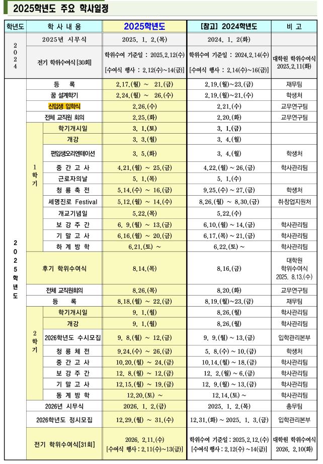 본문 시작 홈으로 학과생활 학과소개 교수소개 교과과정 학과생활 홈페이지가이드 사진게시판 공지사항 사진게시판 전공자료실 동아리 학과행사 사진게시판 페이스북 트위터 프린트 [교무처] 2025학년도 학사일정 산업디자인학과 549 2025-07-14 목록 이전[취창업처] 2025년 알쓸신잡 07월 1주차 다음 [취창업처] 2025년 알쓸신잡 07월 3주차 담당부서 : 산업디자인학과 담당자 : - 연락처 : 043-649-1436 최종수정일 : 2024-10-26 만족도조사 만족도 조사 이 페이지에서 제공하는 정보에 대하여 만족하시나요? 매우만족 만족 보통 불만족 매우불만족