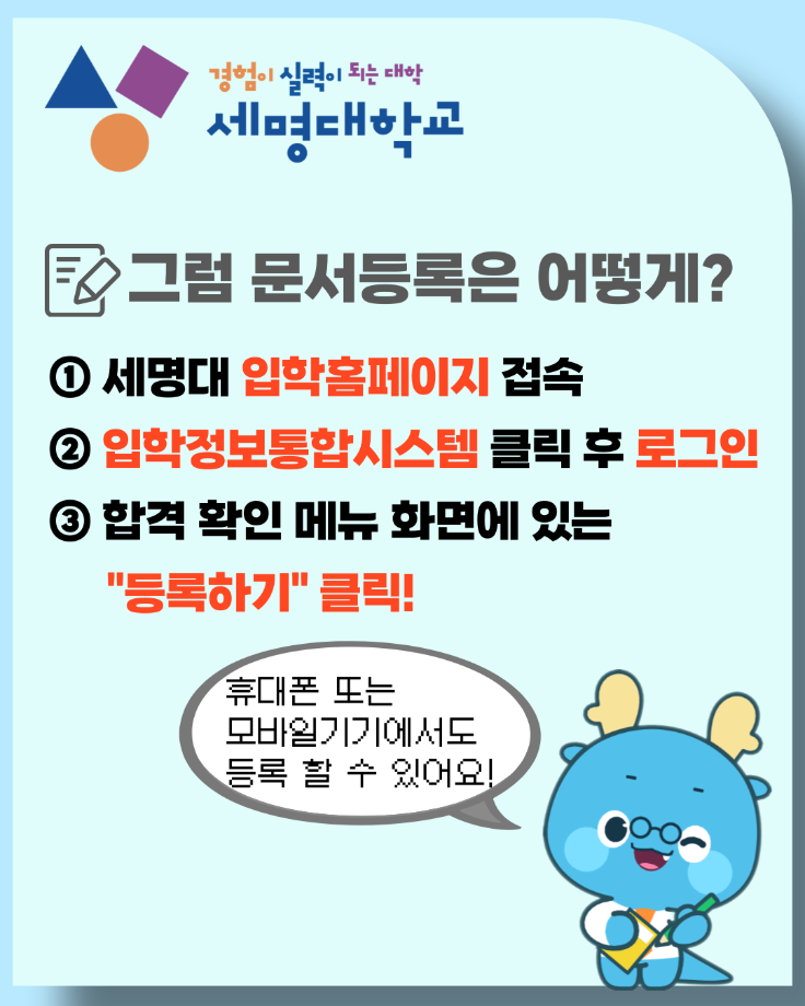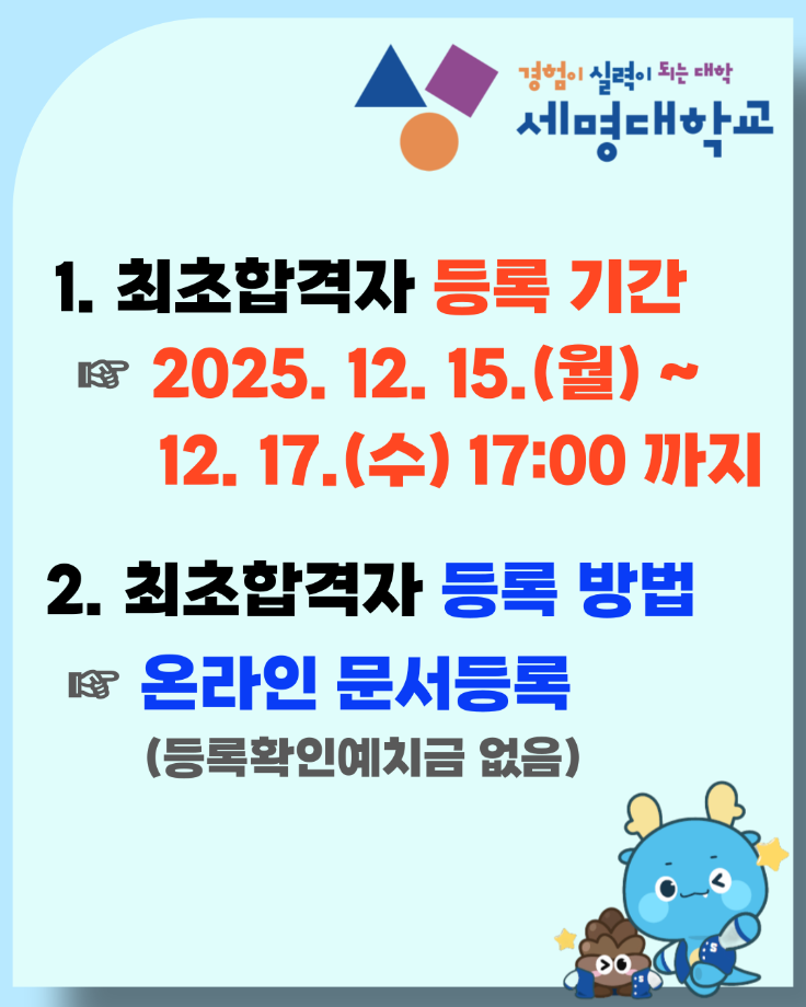 본문 시작 홈으로 학과생활 학과소개 교수소개 교과과정 학과생활 홈페이지가이드 사진게시판 공지사항 사진게시판 전공자료실 동아리 학과행사 사진게시판 페이스북 트위터 프린트 [수시모집] 2026학년도 수시모집 최초합격자 등록안내 산업디자인학과 112 2025-12-15 목록 이전[설경] 세명대학교 설경 다음 [수시모집] 2026학년도 수시모집 충원합격자 발표안내 담당부서 : 산업디자인학과 담당자 : - 연락처 : 043-649-1436 최종수정일 : 2024-10-26 만족도조사 만족도 조사 이 페이지에서 제공하는 정보에 대하여 만족하시나요? 매우만족 만족 보통 불만족 매우불만족