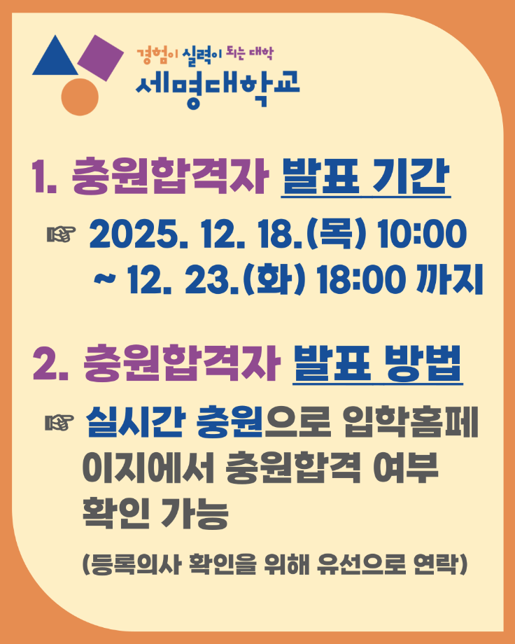 본문 시작 홈으로 학과생활 학과소개 교수소개 교과과정 학과생활 홈페이지가이드 사진게시판 공지사항 사진게시판 전공자료실 동아리 학과행사 사진게시판 페이스북 트위터 프린트 [수시모집] 2026학년도 수시모집 충원합격자 발표안내 산업디자인학과 100 2025-12-18 목록 이전[수시모집] 2026학년도 수시모집 최초합격자 등록안내 다음 [정시모집] 2026 세명대학교 정시모집 전형방법 담당부서 : 산업디자인학과 담당자 : - 연락처 : 043-649-1436 최종수정일 : 2024-10-26 만족도조사 만족도 조사 이 페이지에서 제공하는 정보에 대하여 만족하시나요? 매우만족 만족 보통 불만족 매우불만족