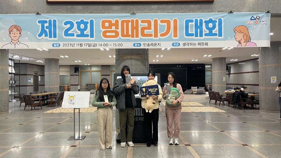 본문 시작 홈으로 포토갤러리 학생위원회 개요 학생위원회 소개 공지사항 활동결과 홈페이지가이드 포토갤러리 페이스북 트위터 프린트 [생각하는 위원회] 제 2회 멍때리기 대회 학술정보 1859 2023-11-17 <제 2회 멍때리기 대회> 일시 : 2023.11.17(금)14:00 참여자 : 17명 수상상품 : 1등_바디필로우 2등_춘식이 팔쿠션 3등_스피디 보조배터리 베스트드레서상_ 장갑 목록 다음 [알려주는 위원회] 최종보고회 부스운영 다음 [꽃피는 위원회] 제 3회 벚꽃축제 담당부서 : 장학복지팀 담당자 : - 연락처 : 043-649-1142 최종수정일 : 2024-10-26 만족도조사 만족도 조사 이 페이지에서 제공하는 정보에 대하여 만족하시나요? 매우만족 만족 보통 불만족 매우불만족