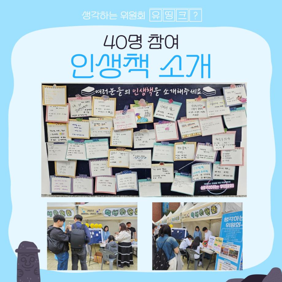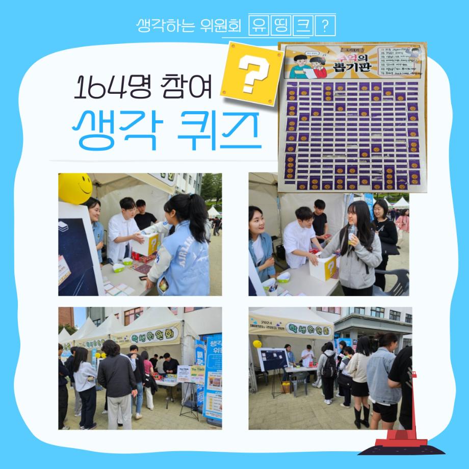 본문 시작 홈으로 포토갤러리 학생위원회 개요 학생위원회 소개 공지사항 활동결과 홈페이지가이드 포토갤러리 페이스북 트위터 프린트 [생각하는 위원회] You Think?(유띵크) 청룡체전부스 학술정보원 1555 2024-05-13 일시 : 2024.05.08(수) 14:00~17:00 장소 : 학생회관 앞 광장 학생위원회 부스 활동내용 : 생각퀴즈(생각박스, 상식퀴즈, 난센스퀴즈) 진행 참여인원 : 164명 참여 생각하는 위원회 행사에 많은 관심과 참여해 주신 구성원 여러분께 감사의 말씀드립니다! 추천해주신 인생책은 5월말 생각하는 위원회 행사에 반영될 예정입니다. 앞으로의 행사도 함께해 주세요:) 목록 이전[꽃피는 위원회] 행운을 가져다주는 책갈피 만들기 다음 [약속하는 위원회] <약속편지> 담당부서 : 장학복지팀 담당자 : - 연락처 : 043-649-1142 최종수정일 : 2024-10-26 만족도조사 만족도 조사 이 페이지에서 제공하는 정보에 대하여 만족하시나요? 매우만족 만족 보통 불만족 매우불만족