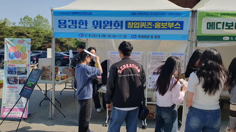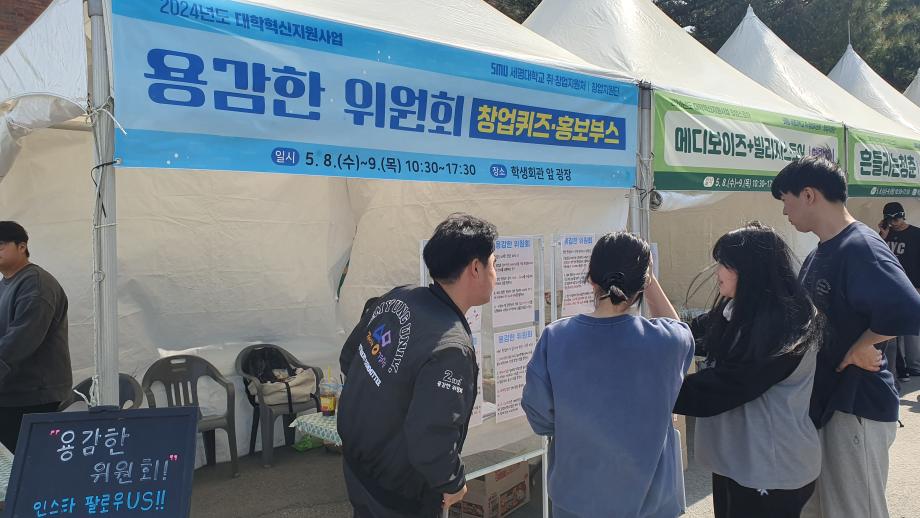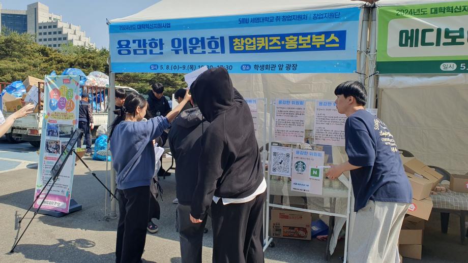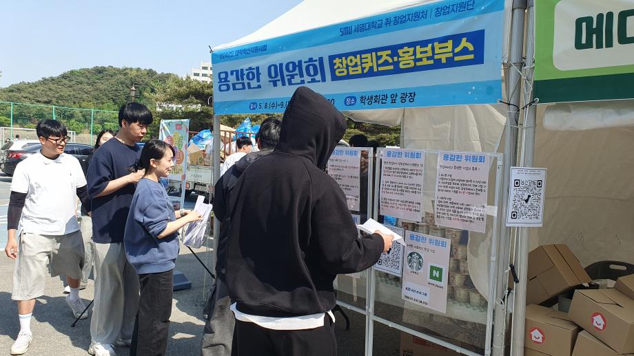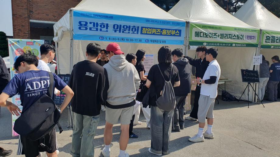 4. 활동목적: 청룡체전 기간, 부스를 운영하여 ‘용감한 위원회’ 활동에 대해 간단히 설명하고, 창업에 관심이 있거나 창업을 희망하는 재학생에게 용감한 위원회에서 창업에 대한 기초 창업퀴즈 이벤트 부스를 진행함으로써 창업 장벽을 낮추고, 창업에 대한 지식 습득을 통하여 창업관심도 제고를 위함