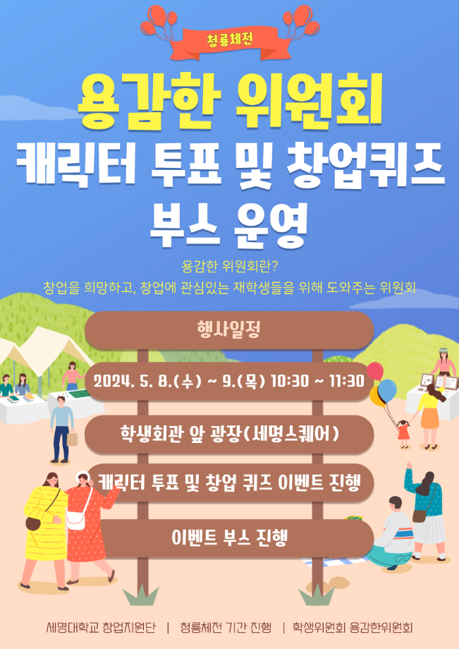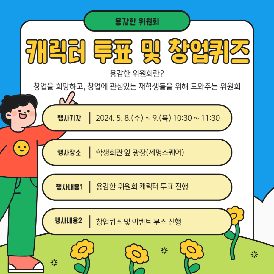 저희 용감한 위원회는 앞으로도 창업의 장벽을 낮추고자 창업에 관하여 더욱 재미있는 이벤트 활동을 진행하도록 하겠습니다! 저희 용감한 위원회는 이번 활동을 통해 부족한 부분을 보완하여 앞으로 활동을 진행할 예정이니, 많은 관심 부탁드립니다. 참여해주신 모든 재학생 여러분께 감사 인사드립니다!