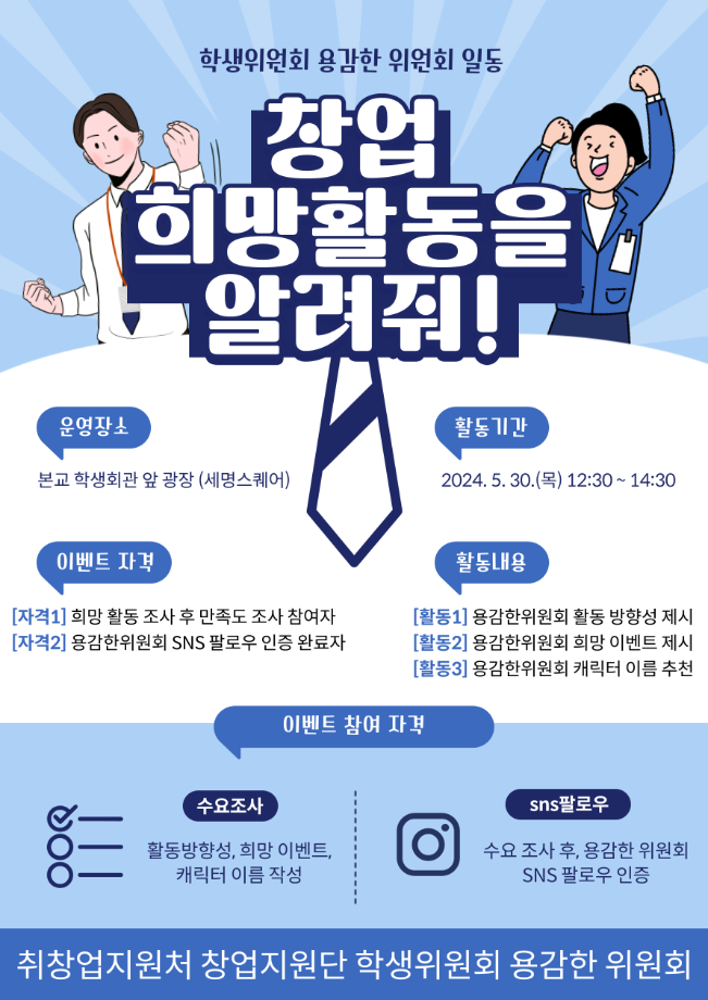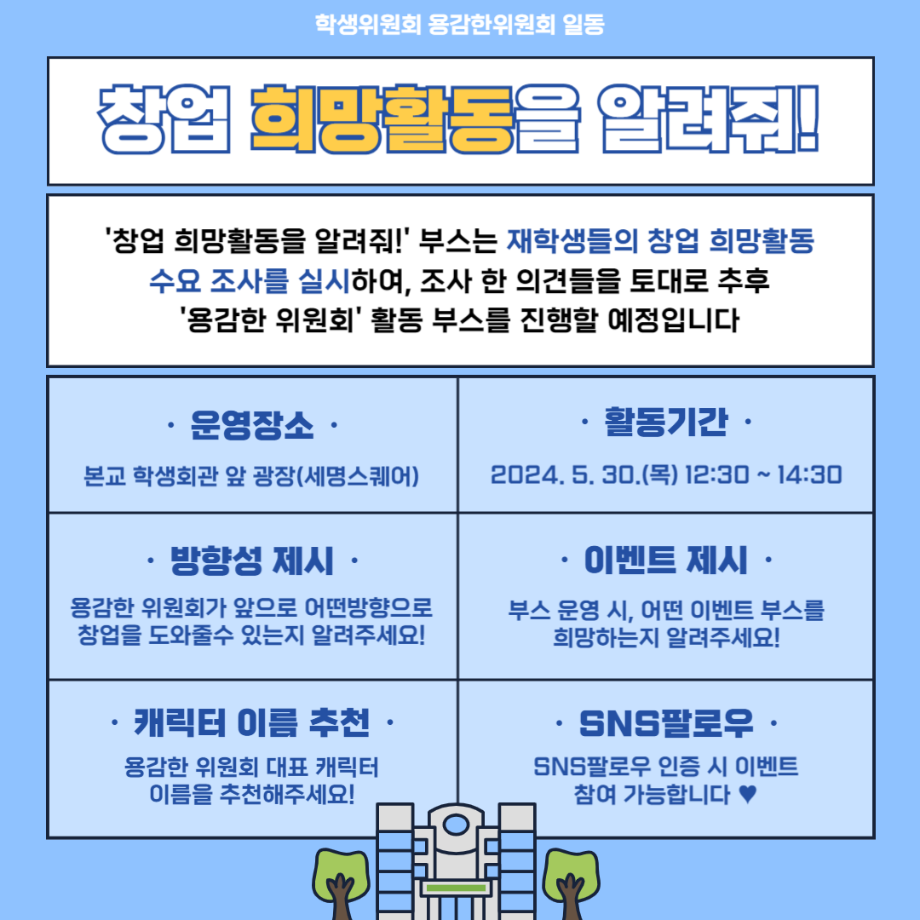 재학생들의 의견을 토대로 2학기 ‘용감한 위원회’ 활동을 진행하고자 이번 활동을 진행하였습니다. 다양한 아이디어를 제시해주셔서 감사드리며, 2학기 활동 기대해주세요! 이번 활동에도 많이 참여해주셔서 감사합니다!