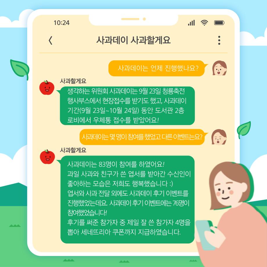 활동내용 : 엽서를 제공하여 친구에게 사과할 수 있는 기회 제공. 엽수 접수 기간이 마감되고 과일 사과와 친구가 쓴 편지를 포장하여 수신인에게 전달. 편지를 쓴 친구는 사과를 받지 못하는 아쉬움을 달래줄 후기 이벤트 참여로 후기 잘 쓴 참여자 4명에게 세네뜨리아 5000원 쿠폰 증정