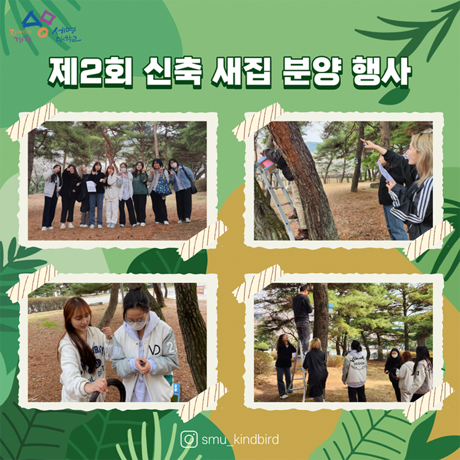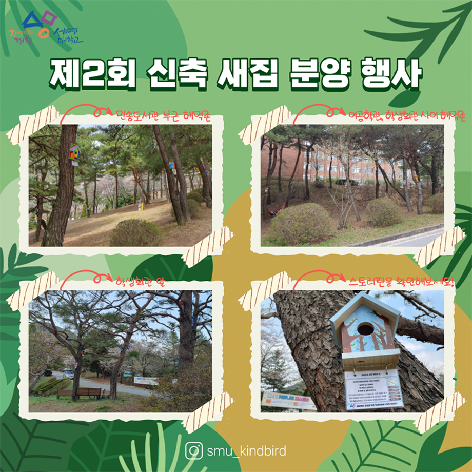 ◎ 새집 설치 장소 : 민송도서관 부근 해먹존(생각하는 존), 학생회관 및 이공학관 사이 해먹존(생각하는 존), 학생회관 앞