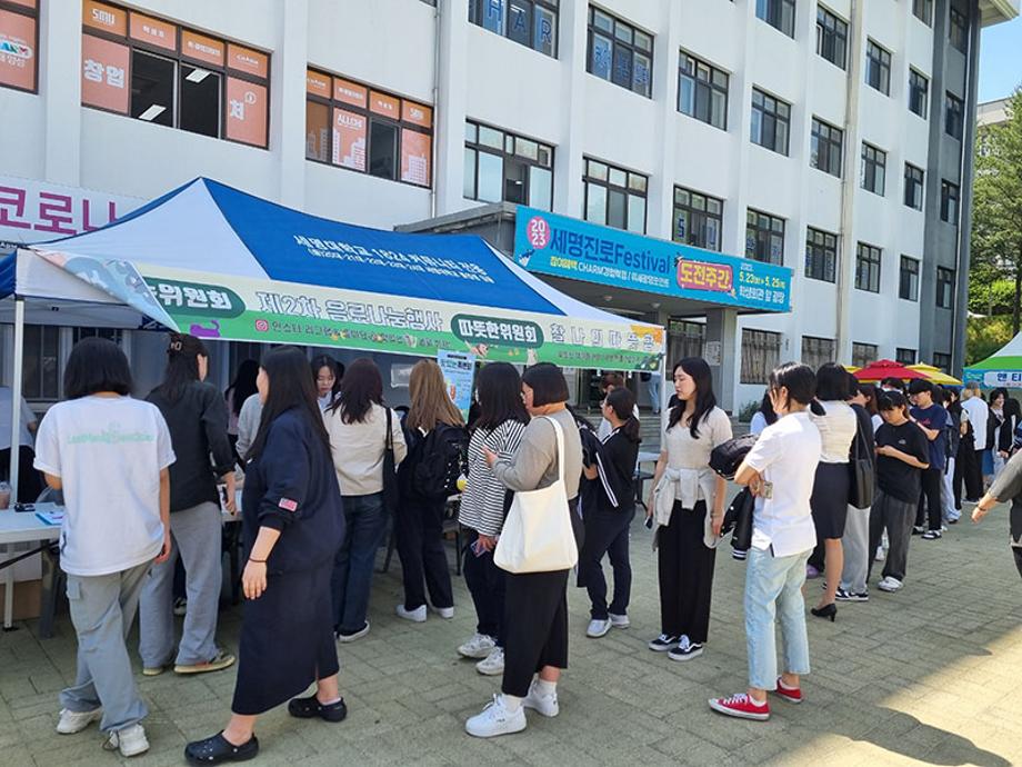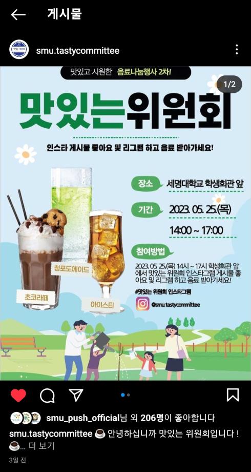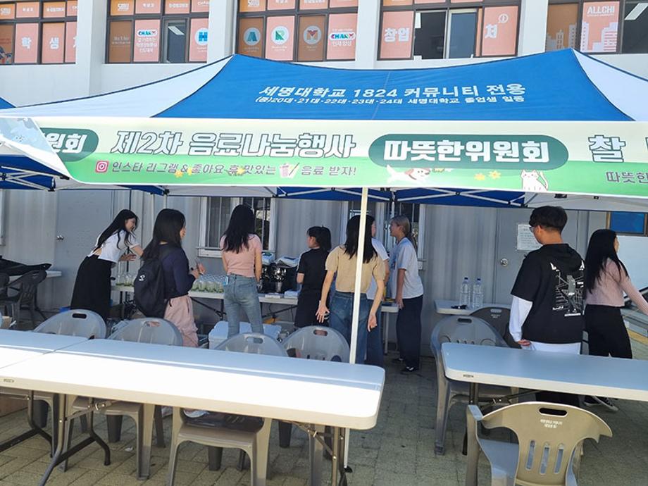 본문 시작 홈으로 포토갤러리 학생위원회 개요 학생위원회 소개 공지사항 활동결과 홈페이지가이드 포토갤러리 페이스북 트위터 프린트 [맛있는 위원회]제 2회 음료나눔행사 학생처 3170 2023-06-01 세명대학교 재미있는 경험을 위한 학생위원회 중 '맛있는 위원회'는 5월 25일(목) 14시부터 17시까지 학생회관 앞에서 음료나눔행사를 진행하였다. 음료 메뉴는 5월 18일 청룡체전기간 동안 진행한 설문조사 결과를 반영하여 선정하였고, 초코라떼, 청포도에이드, 아이스티, 커피 음료를 제공하였다. 추가로, '맛있는위원회'는 이날 음료나눔행사를 통해 공식 SNS를 공유하여 본교 구성원과의 소통을 위한 자리를 가졌다. 목록 이전[알려주는 위원회] 너의MBTI를 알려줘 다음 [따뜻한 위원회] 찰나의 따뜻함 담당부서 : 장학복지팀 담당자 : - 연락처 : 043-649-1142 최종수정일 : 2024-10-26 만족도조사 만족도 조사 이 페이지에서 제공하는 정보에 대하여 만족하시나요? 매우만족 만족 보통 불만족 매우불만족