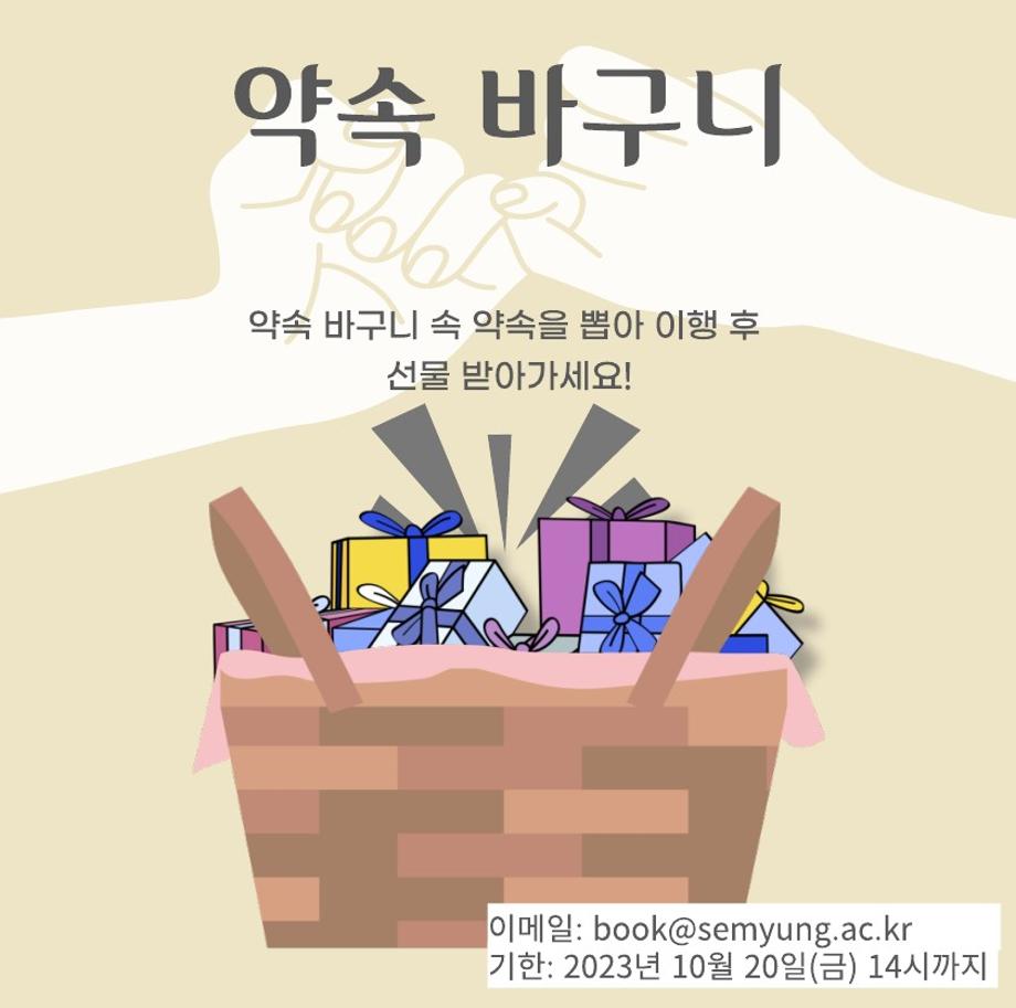 세명대학교 재미있는 경험을 위한 학생위원회 중 ‘약속하는 위원회’는 2023년 9월 21일(목) 11시부터 14시 30분까지 뭐든지 광장에서 ‘약속바구니’ 활동을 진행하였다.