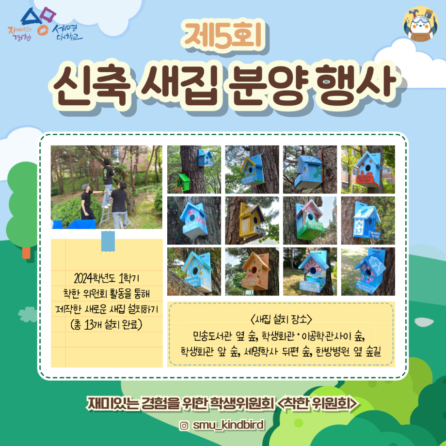 - 2024학년도 1학기 착한 위원회 활동을 통해 제작한 새집 설치(13개)