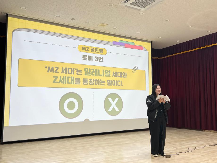 본문 시작 홈으로 포토갤러리 학생위원회 개요 학생위원회 소개 공지사항 활동결과 홈페이지가이드 포토갤러리 페이스북 트위터 프린트 [통하는 위원회]MZ 골든벨 대학혁신지원단 1598 2024-06-07 1) 행사일시 : 2024.05.07.(목) 14:00 2) 행사장소 : 민송도서관 S:MU 콘텐츠홀 3) 행사내용 : MZ 세대와 X 세대 문화를 주제로 골든벨을 개최하여 교직원들과 학생들이 서로의 문화를 배우고 가까워질 수 있는 계기를 마련 4) 참여인원 : 38명 - 통하는 위원회 13명 - 참여자 25명 (교수 3명, 조교 9명, 직원 12명) 목록 이전[통하는 위원회] MZ력 & X력 테스트 다음 [밀어주는 위원회] 꿈실현장학금 장학증서 수여식 담당부서 : 장학복지팀 담당자 : - 연락처 : 043-649-1142 최종수정일 : 2024-10-26 만족도조사 만족도 조사 이 페이지에서 제공하는 정보에 대하여 만족하시나요? 매우만족 만족 보통 불만족 매우불만족