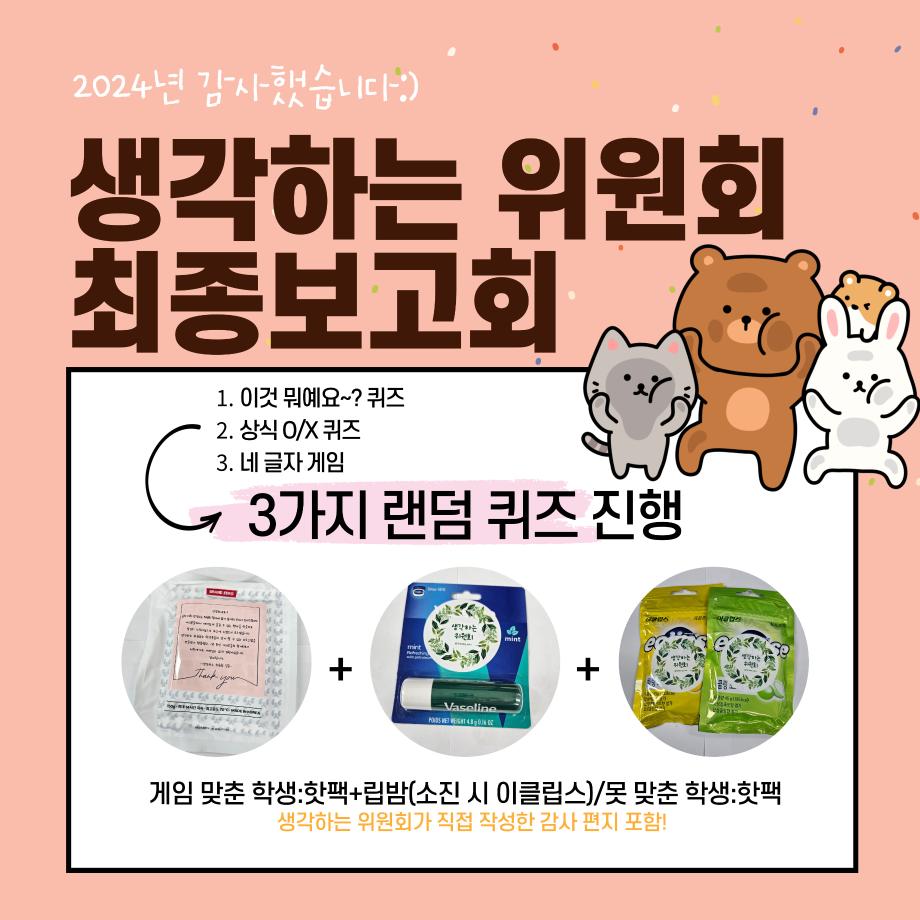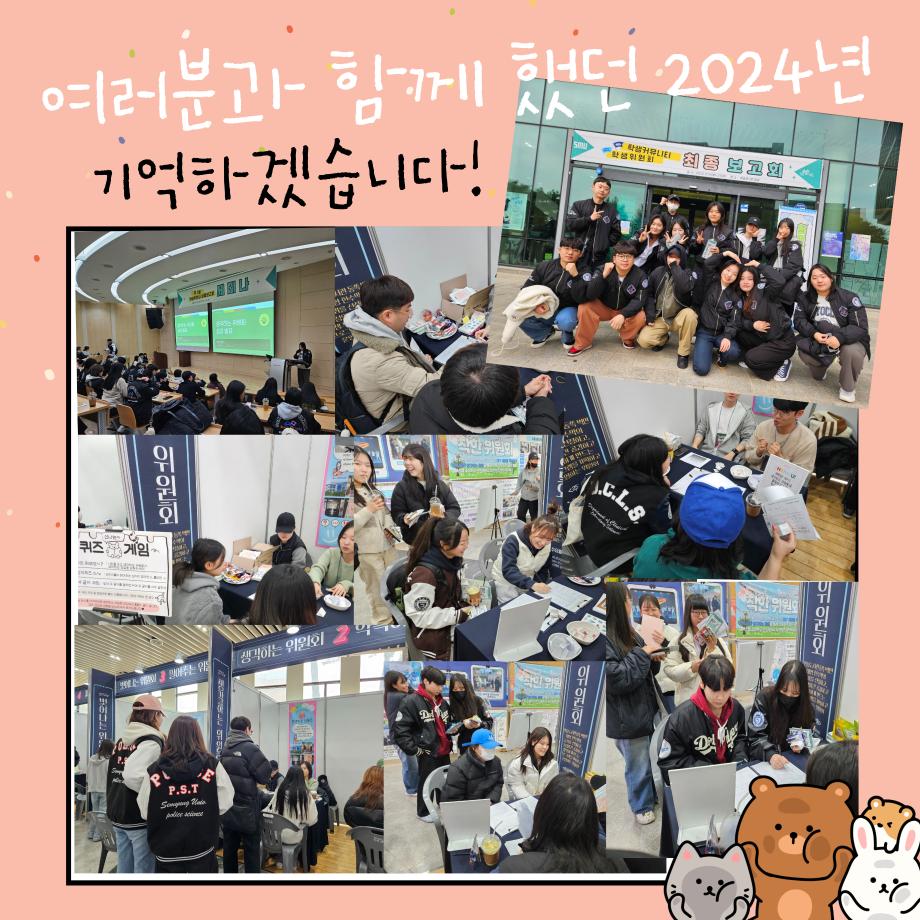 본문 시작 홈으로 포토갤러리 학생위원회 개요 학생위원회 소개 공지사항 활동결과 홈페이지가이드 포토갤러리 페이스북 트위터 프린트 [생각하는 위원회] 최종보고회 감사이벤트 학술정보원 1464 2024-11-25 일시 : 2024.11.21(목) 장소 : 학술관 1층 로비 활동내용 : 생각하는 위원회 상담 및 가신청, 게임 진행하여 상품 전달 참여인원 : 154명 올해 생각하는 위원회를 사랑해주신 학생 여러분께 감사의 말씀 전합니다. 작게나마 최종보고회 부스를 통해 감사함을 전달할 수 있는 좋은 시간이었습니다. 2025년 학생위원회 많은 관심 부탁드립니다:) 감사합니다! 목록 이전[용감한 위원회]도전! 인테리어 창업 체험부츠 운영 이전[생각하는 위원회] 사과데이 담당부서 : 장학복지팀 담당자 : - 연락처 : 043-649-1142 최종수정일 : 2024-10-26 만족도조사 만족도 조사 이 페이지에서 제공하는 정보에 대하여 만족하시나요? 매우만족 만족 보통 불만족 매우불만족