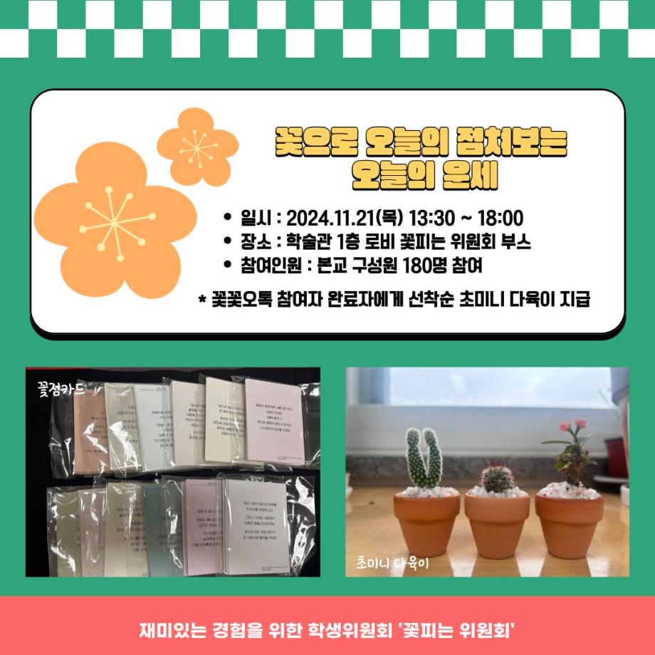 본문 시작 홈으로 포토갤러리 학생위원회 개요 학생위원회 소개 공지사항 활동결과 홈페이지가이드 포토갤러리 페이스북 트위터 프린트 [꽃피는 위원회] 오늘의 운세 꽃꽃오톡 학생처 1896 2024-11-30 꽃피는 위원회 [오늘의 운세 꽃꽃오톡] 일시 : 2024.11.21(목) 13:30 ~ 재료소진시 까지 장소 : 학술관 1층 학생위원회 부스 참여조건 : 꽃피는 위원회 활동 만족도 조사 참여자 내용 : 랜덤돌리기를 통한 꽃운세를 점쳐보고 선착순 초미니 다육이 선물받기 참여인원 : 본교 구성원 180명 참여 목록 다음 용감한 위원회 「최종보고회」 홍보부스 운영 다음 [용감한 위윈회]나만의 하바리움, 공방 창업의 시작! 담당부서 : 장학복지팀 담당자 : - 연락처 : 043-649-1142 최종수정일 : 2024-10-26 만족도조사 만족도 조사 이 페이지에서 제공하는 정보에 대하여 만족하시나요? 매우만족 만족 보통 불만족 매우불만족