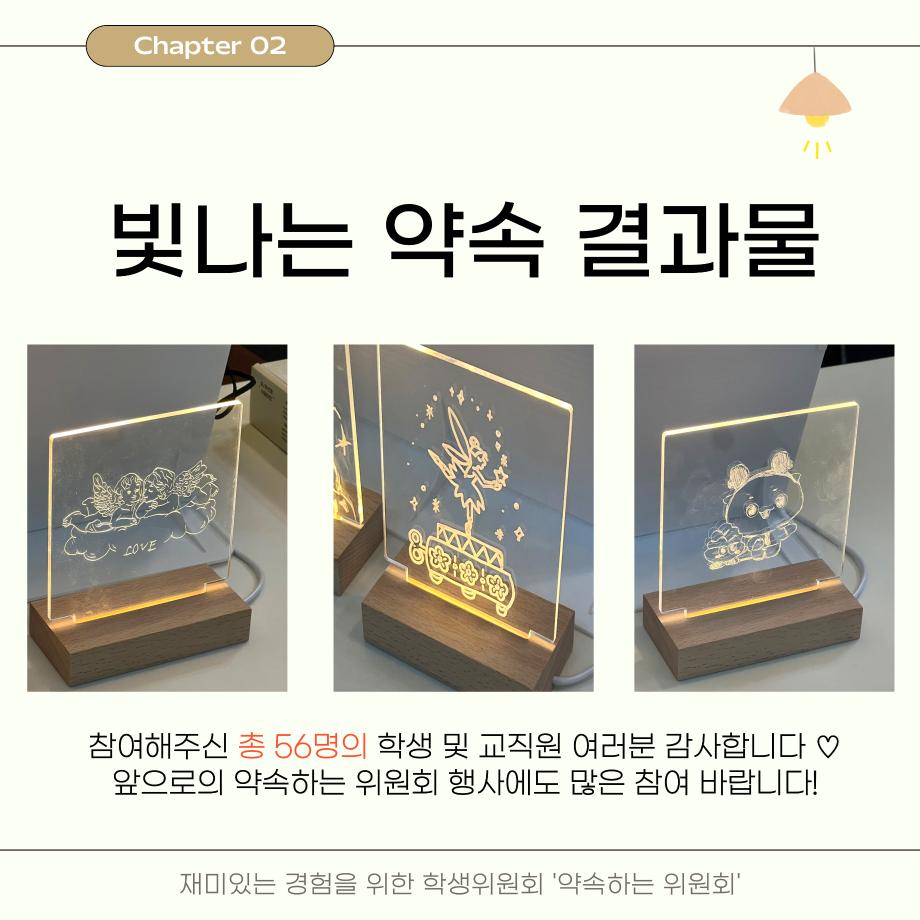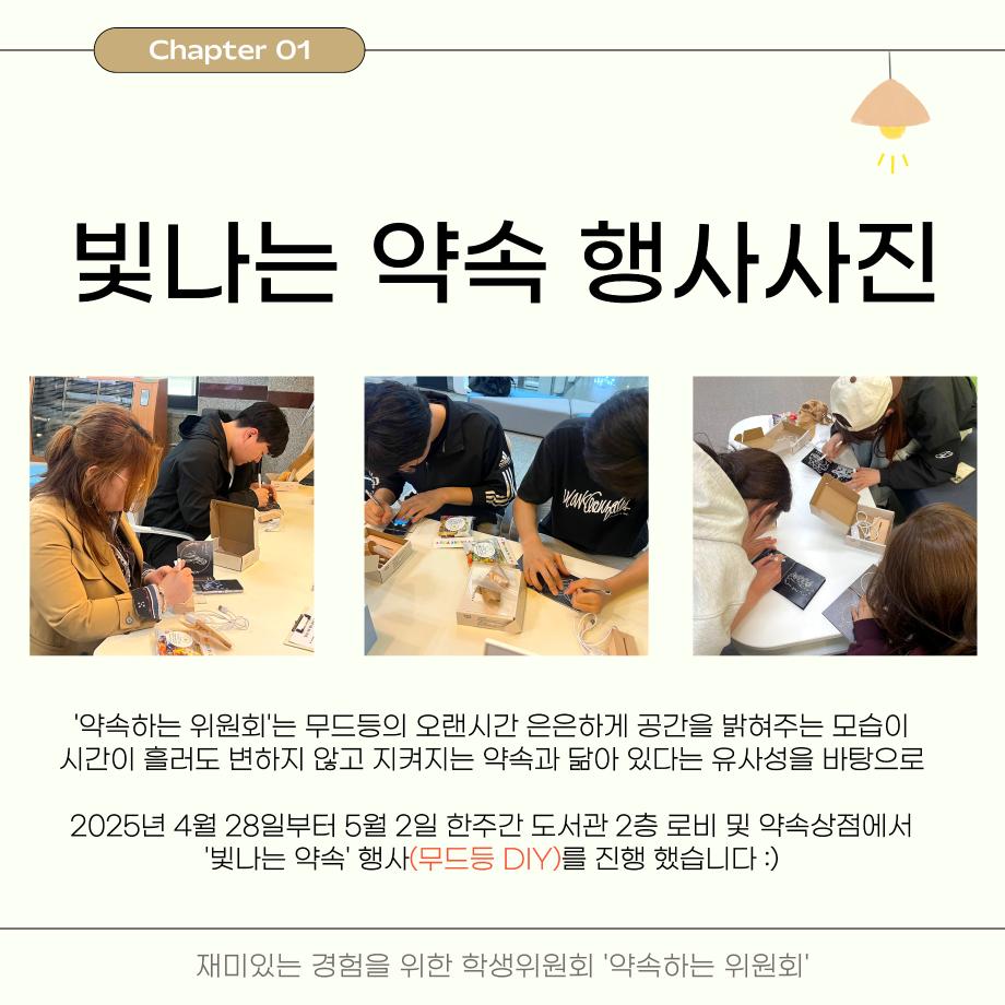 본문 시작 홈으로 포토갤러리 학생위원회 개요 학생위원회 소개 공지사항 활동결과 홈페이지가이드 포토갤러리 페이스북 트위터 프린트 [약속하는 위원회] 빛나는 약속 학술정보원 792 2025-05-13 안녕하세요 재미있는 경험을 위한 학생위원회 '약속하는 위원회' 입니다! 약속하는 위원회 행사인 빛나는 약속 활동이 성황리에 마무리 되었습니다 :) [빛나는 약속 행사 결과] 일시 : 2025년 4월 28일(월) ~ 5월 2일(금) 장소 : 도서관 2층 로비 및 약속상점 행사 참여자 : 56명 빛나는 약속 행사에 참여해주신 모든 분들께 진심으로 감사드립니다! 추후에 이어질 약속하는 위원회 활동도 많은 관심 바랍니다! 목록 이전제 3기 학생위원회 최종보고회 다음 [생각하는 위원회]생각 다락방 담당부서 : 장학복지팀 담당자 : - 연락처 : 043-649-1142 최종수정일 : 2024-10-26 만족도조사 만족도 조사 이 페이지에서 제공하는 정보에 대하여 만족하시나요? 매우만족 만족 보통 불만족 매우불만족