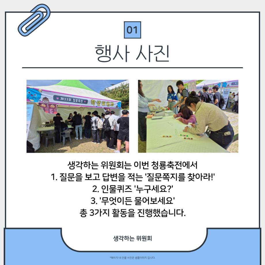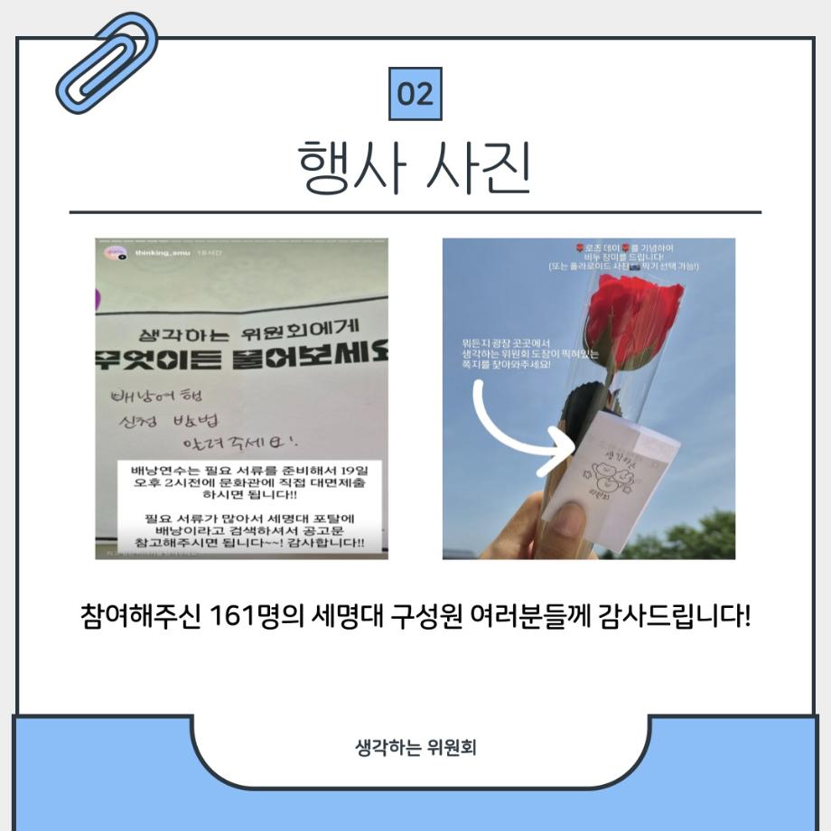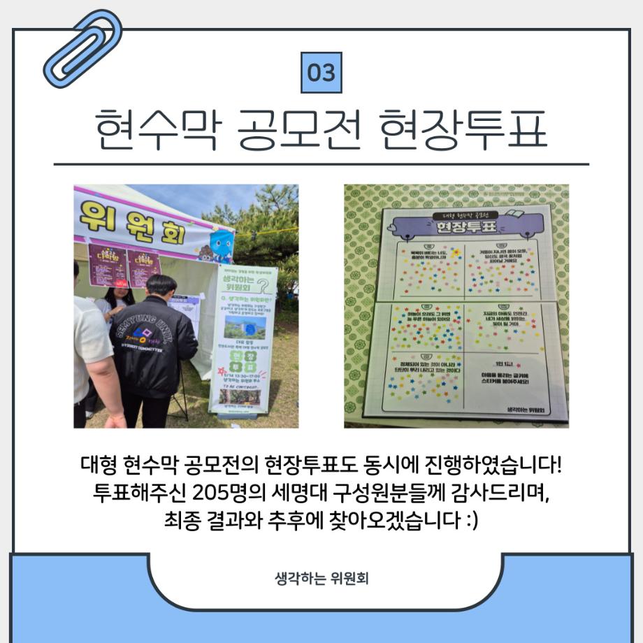 본문 시작 홈으로 포토갤러리 학생위원회 개요 학생위원회 소개 공지사항 활동결과 홈페이지가이드 포토갤러리 페이스북 트위터 프린트 [생각하는 위원회]생각 다락방 학술정보원 948 2025-05-22 프로그램명 : 생각 다락방 일시 : 2025.05.14(수) 13:30~17:00 장소 : 뭐든지 광장 학생위원회 부스 활동내용 : 질문쪽지 찾기, 인물퀴즈, 무엇이든 물어보세요, 대형현수막 공모전 현장투표 참여인원 : 부스 행사 161명 참여, 대형현수막 공모전 현장투표 205명 참여 대형현수막 공모전 현장투표는 추후에 최종 결과를 만나보실 수 있습니다🤍 앞으로도 생각하는 위원회와 함께 해요! 목록 이전[약속하는 위원회] 빛나는 약속 이전[꽃피는 위원회] 제4회 벚꽃축제 '벚꽃세봄' 담당부서 : 장학복지팀 담당자 : - 연락처 : 043-649-1142 최종수정일 : 2024-10-26 만족도조사 만족도 조사 이 페이지에서 제공하는 정보에 대하여 만족하시나요? 매우만족 만족 보통 불만족 매우불만족