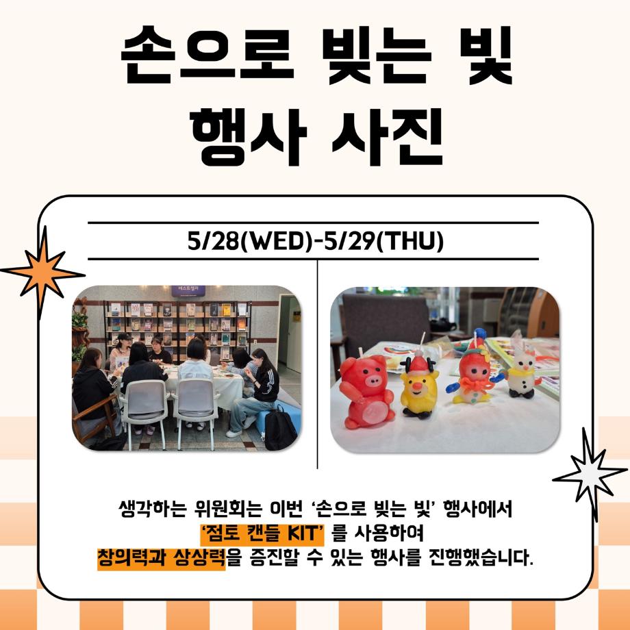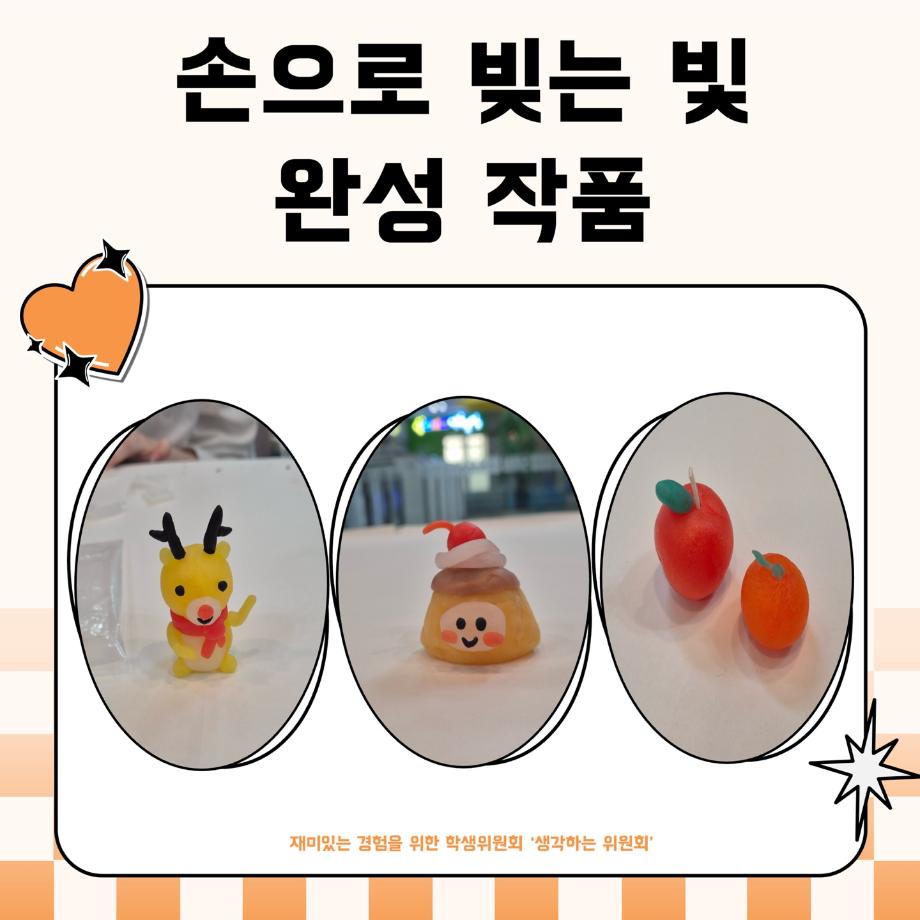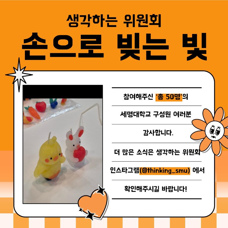 본문 시작 홈으로 포토갤러리 학생위원회 개요 학생위원회 소개 공지사항 활동결과 홈페이지가이드 포토갤러리 페이스북 트위터 프린트 [생각하는 위원회] 손으로 빚는 빛 학술정보원 862 2025-05-30 프로그램명 : 손으로 빚는 빛 일시 : 2025년 5월 28일(수)~29일(목) 13:30~16:00 장소 : 도서관 2층 로비 활동내용 : 점토양초 DIY로 나만의 양초 만들기 행사 참여자 : 50명 안녕하세요! 재미있는 경험을 위한 학생위원회 '생각하는 위원회'입니다 :) 손으로 빚는 빛 행사에 참여해주신 모든 분들께 감사드립니다! 앞으로도 생각하는 위원회의 활동들에 많은 관심 부탁드립니다🤍 목록 다음 [생각하는 위원회] 대형 현수막 문구 공모전 'Hear, 위로' 다음 [약속하는 위원회] 뽕뽕오락실 담당부서 : 장학복지팀 담당자 : - 연락처 : 043-649-1142 최종수정일 : 2024-10-26 만족도조사 만족도 조사 이 페이지에서 제공하는 정보에 대하여 만족하시나요? 매우만족 만족 보통 불만족 매우불만족