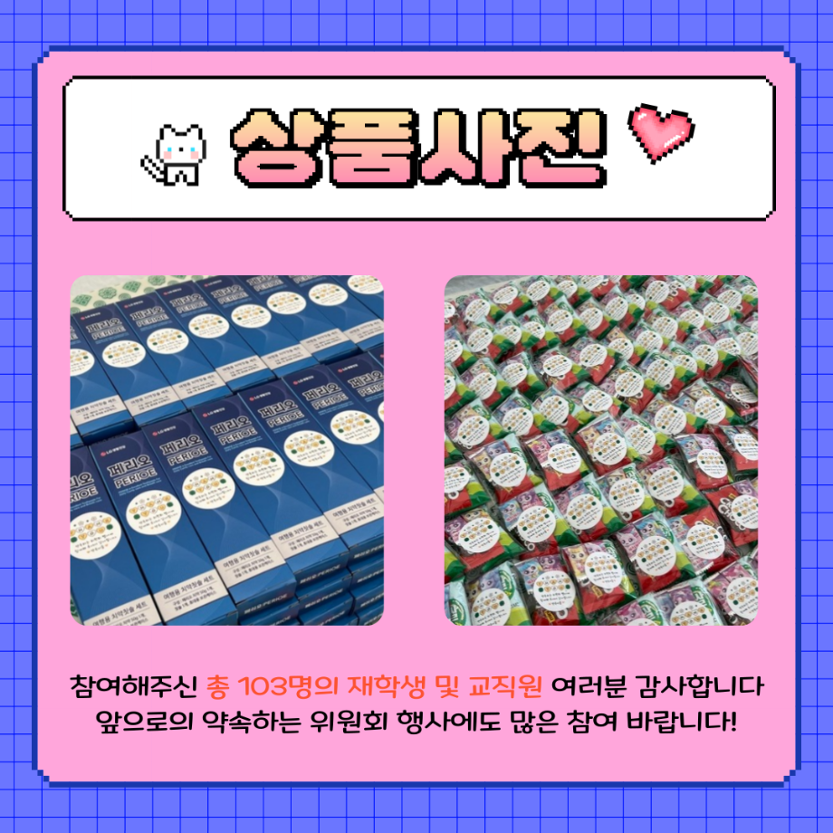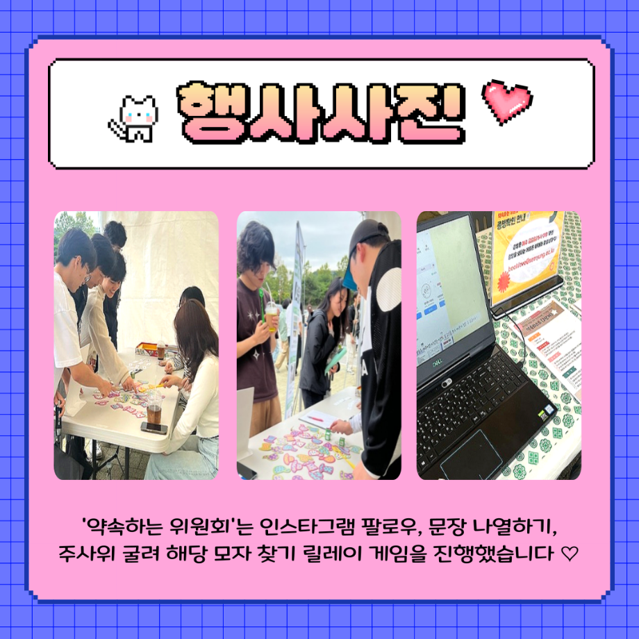 본문 시작 홈으로 포토갤러리 학생위원회 개요 학생위원회 소개 공지사항 활동결과 홈페이지가이드 포토갤러리 페이스북 트위터 프린트 [약속하는 위원회] 뽕뽕오락실 학술정보원 254 2025-09-24 안녕하세요 재미있는 경험을 위한 학생위원회 '약속하는 위원회' 입니다! 약속하는 위원회 행사인 뿅뿅! 약속오락실! 활동이 성황리에 마무리 되었습니다 :) [뿅뿅! 약속오락실! 행사 결과] 일시 : 2025년 9월 24일(수) 14시~17시 장소 : 학생회관 앞 광장 행사 참여자 : 103명 뿅뿅! 약속오락실! 행사에 참여해주신 모든 분들께 진심으로 감사드립니다! 추후에 이어질 약속하는 위원회 활동도 많은 관심 바랍니다! 목록 이전[생각하는 위원회] 손으로 빚는 빛 다음 [꽃피는 위원회] 꽃 돌려라 피어라 담당부서 : 장학복지팀 담당자 : - 연락처 : 043-649-1142 최종수정일 : 2024-10-26 만족도조사 만족도 조사 이 페이지에서 제공하는 정보에 대하여 만족하시나요? 매우만족 만족 보통 불만족 매우불만족