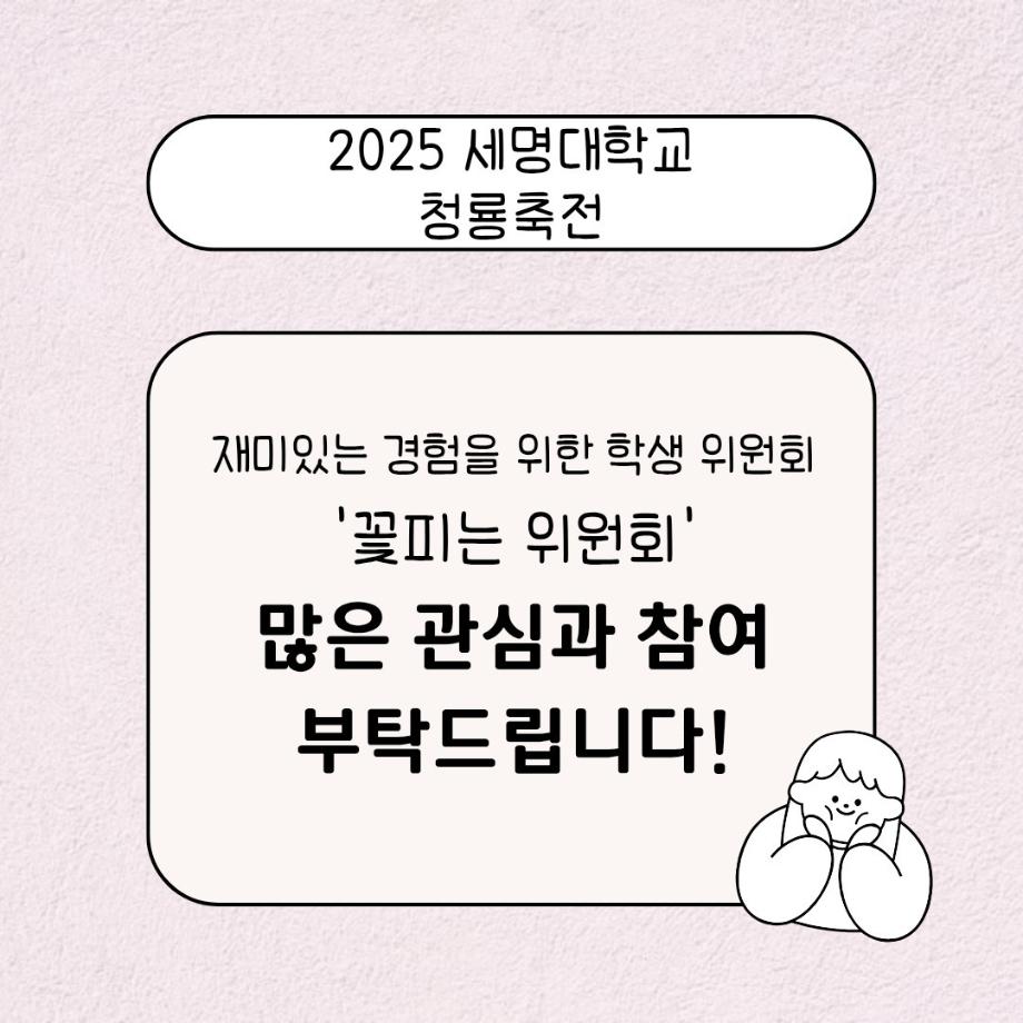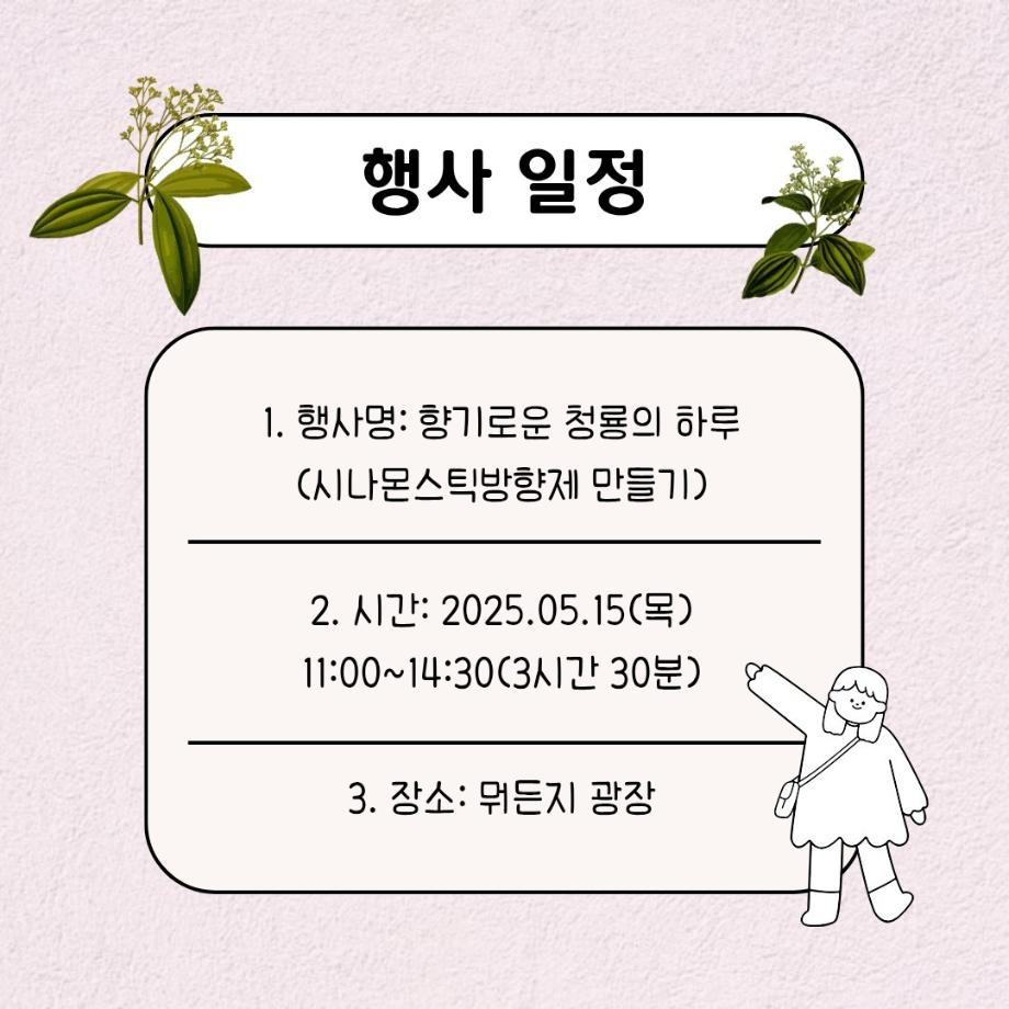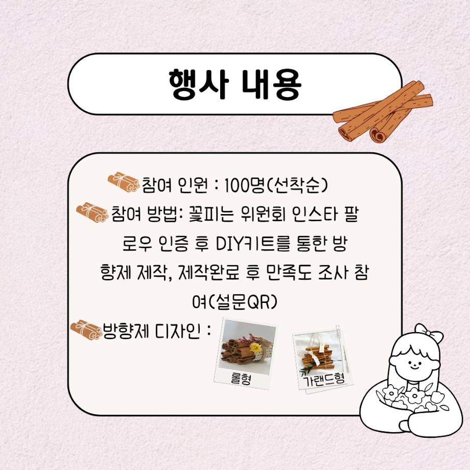 본문 시작 홈으로 공지사항 학생위원회 개요 학생위원회 소개 공지사항 활동결과 홈페이지가이드 프로그램 계획 프로그램 계획 세명대학교 공지사항 프로그램 계획 페이스북 트위터 프린트 [꽃피는 위원회] 향기로운 청룡의 하루(시나몬스틱 방향제 만들기) 학생처 515 2025-05-15 [향기로운 청룡의 하루(시나몬스틱 방향제 만들기) 1)일시: 2025.05.15(목) 11:00~14:30 2)장소: 뭐든지 광장 학생위원회 부스 3)대상: 본교 구성원 100명 한정 4)내용 : 꽃피는 위원회 인스타 팔로우 인증 -> 참여키트 수령 후 참여 -> 참여완료자 설문조사 참여(참여사진 업로드) -> 완료 많은 참여부탁드립니다. 목록 이전[용감한 위원회] 세명상점 다음 [착한 위원회] 향기를 담다 나를 담다 담당부서 : 장학복지팀 담당자 : - 연락처 : 043-649-1142 최종수정일 : 2024-10-26 만족도조사 만족도 조사 이 페이지에서 제공하는 정보에 대하여 만족하시나요? 매우만족 만족 보통 불만족 매우불만족