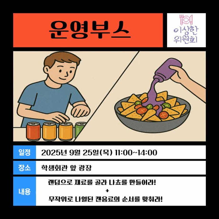본문 시작 홈으로 공지사항 학생위원회 개요 학생위원회 소개 공지사항 활동결과 홈페이지가이드 프로그램 계획 프로그램 계획 세명대학교 공지사항 프로그램 계획 페이스북 트위터 프린트 [이상한 위원회] 유쾌하거나 불쾌하거나 학생처 292 2025-09-25 안녕하세요 🍽 이상한 위원회 🍽 입니다 청룡체전 기간 중 이상한 위원회에서 나쵸 만들기와 캔 위치 맞히기 게임을 진행하는 홍보 부스를 운영합니다! 🍭 이상한 위원회 인스타도 팔로우 하고 재미있는 경험하고 가세요🤗 ✅ 선착순 150명 ✅ 일시: 2025. 9. 25.(목) ✅ 시간: 11시~14시 ✅ 장소: 학생회관 앞 광장 많은 참여와 관심 부탁드립니다❤ 목록 이전[용감한 창업자] 어떤 향이 좋아? 이전[밀어주는 위원회] 너의 꿈, 우리가 밀어줄게! 담당부서 : 장학복지팀 담당자 : - 연락처 : 043-649-1142 최종수정일 : 2024-10-26 만족도조사 만족도 조사 이 페이지에서 제공하는 정보에 대하여 만족하시나요? 매우만족 만족 보통 불만족 매우불만족