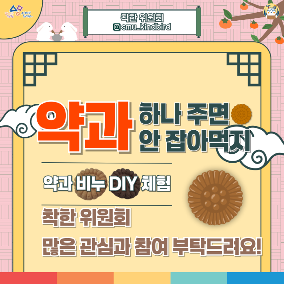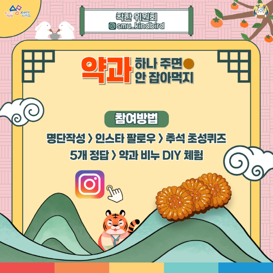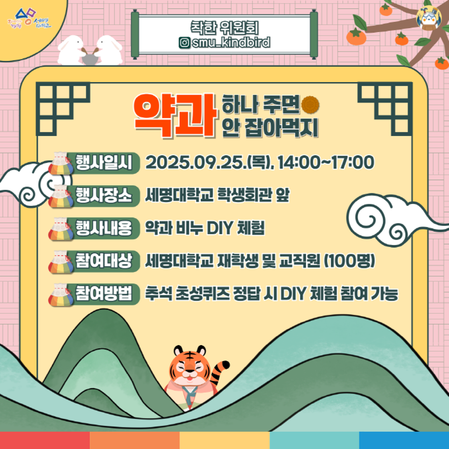 본문 시작 홈으로 공지사항 학생위원회 개요 학생위원회 소개 공지사항 활동결과 홈페이지가이드 프로그램 계획 프로그램 계획 세명대학교 공지사항 프로그램 계획 페이스북 트위터 프린트 [착한 위원회] 약과하나 주면 안잡아 먹지 학생처 134 2025-09-24 [착한 위원회] 약과 하나 주면 안 잡아먹지 1. 행사일시 ■ 2025년 9월 25일(목), 14시~17시 2. 행사장소 ■ 본교 학생회관 앞 3. 행사내용 ■ 추석 추성퀴즈 및 약과 비누 DIY 체험 4. 참여대상 ■ 본교 재학생 및 교직원 100명(선착순) 목록 이전[건강한 위원회] back tk spot 제자리로 다음 [꽃피는 위원회] 북!마크!해버렸지뭐야 담당부서 : 장학복지팀 담당자 : - 연락처 : 043-649-1142 최종수정일 : 2024-10-26 만족도조사 만족도 조사 이 페이지에서 제공하는 정보에 대하여 만족하시나요? 매우만족 만족 보통 불만족 매우불만족