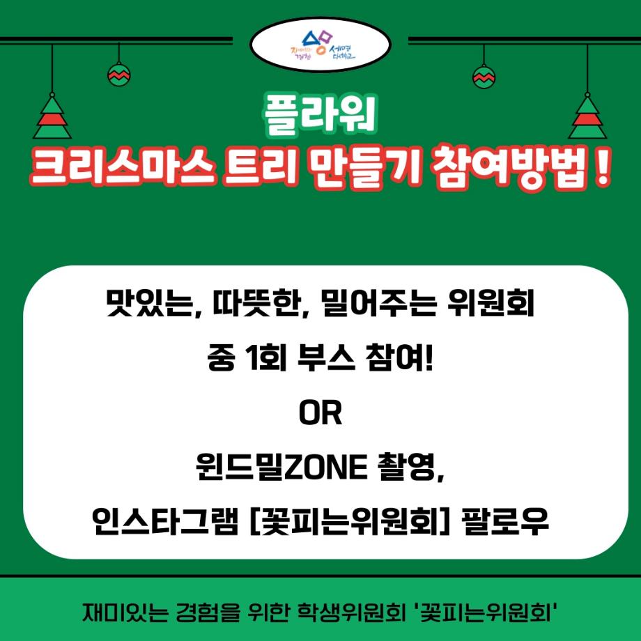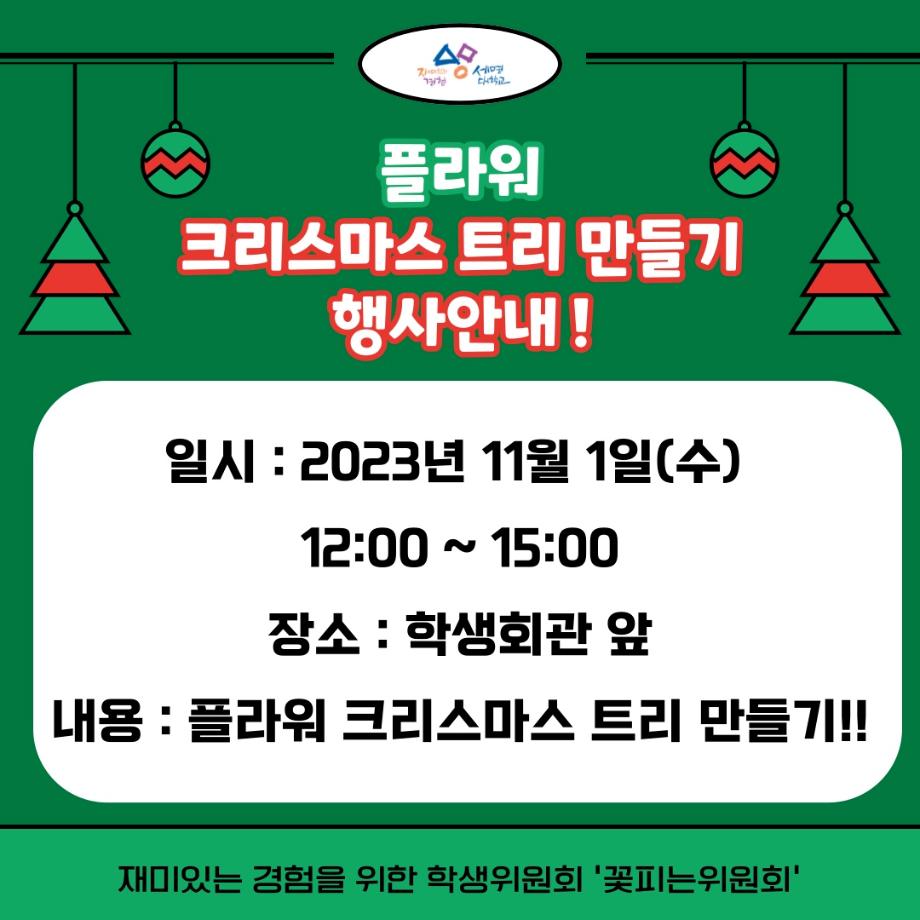 본문 시작 홈으로 공지사항 학생위원회 개요 학생위원회 소개 공지사항 활동결과 홈페이지가이드 프로그램 계획 프로그램 계획 세명대학교 공지사항 프로그램 계획 페이스북 트위터 프린트 [꽃피는 위원회] 플라워트리 만들기 학생처 2307 2023-11-01 미리크리스마스 플라워트리만들기 행사 일시 : 2023.11.01 12:00 ~ 15:00 장소 : 학생회관 앞 광장 목록 이전[통하는 위원회] MZ골든벨 다음 [따뜻한 위원회] 따뜻한 마음은 참(charm) 좋아 담당부서 : 장학복지팀 담당자 : - 연락처 : 043-649-1142 최종수정일 : 2024-10-26 만족도조사 만족도 조사 이 페이지에서 제공하는 정보에 대하여 만족하시나요? 매우만족 만족 보통 불만족 매우불만족