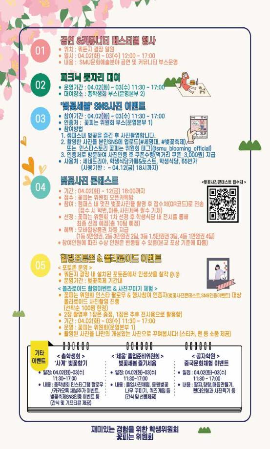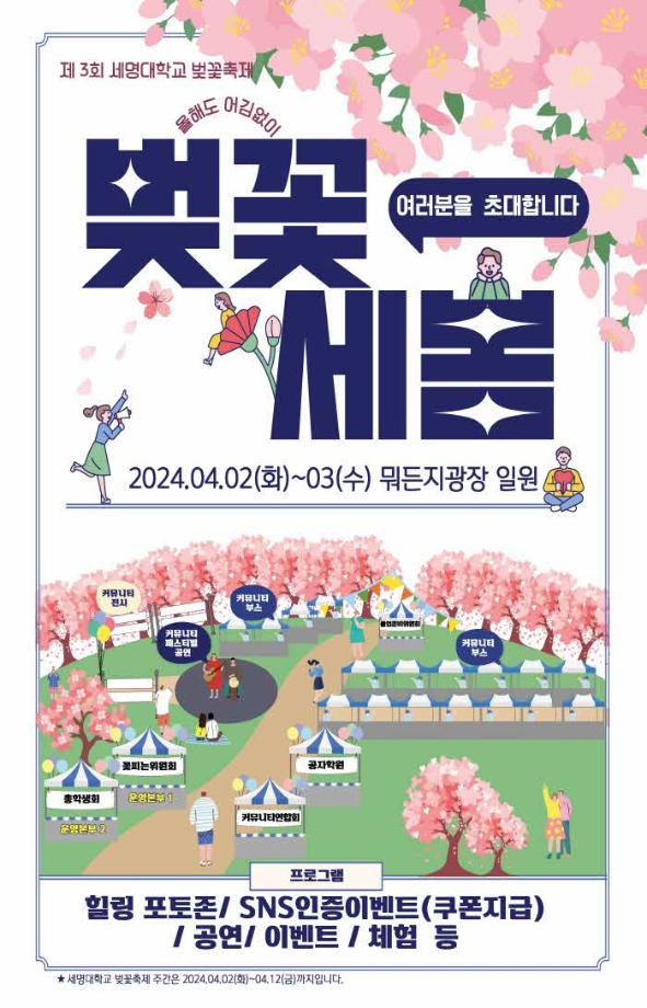 본문 시작 홈으로 공지사항 학생위원회 개요 학생위원회 소개 공지사항 활동결과 홈페이지가이드 프로그램 계획 프로그램 계획 세명대학교 공지사항 프로그램 계획 페이스북 트위터 프린트 [꽃피는 위원회]제 3회 벚꽃축제 진행 학생처 1551 2024-04-02 2024년 세명대학교 제 3회 벚꽃축제를 진행합니다. 벚꽃사진콘테스트, sns사진업로드 이벤트, 폴라로이드이벤트 등 여러가지 프로그램을 실시하오니 많은 참여부탁드립니다. 목록 이전[생각하는 위원회] 제 3차 생각게시판 운영 다음 [약속하는 위원회] 2024년도 약속상점 운영안내 담당부서 : 장학복지팀 담당자 : - 연락처 : 043-649-1142 최종수정일 : 2024-10-26 만족도조사 만족도 조사 이 페이지에서 제공하는 정보에 대하여 만족하시나요? 매우만족 만족 보통 불만족 매우불만족