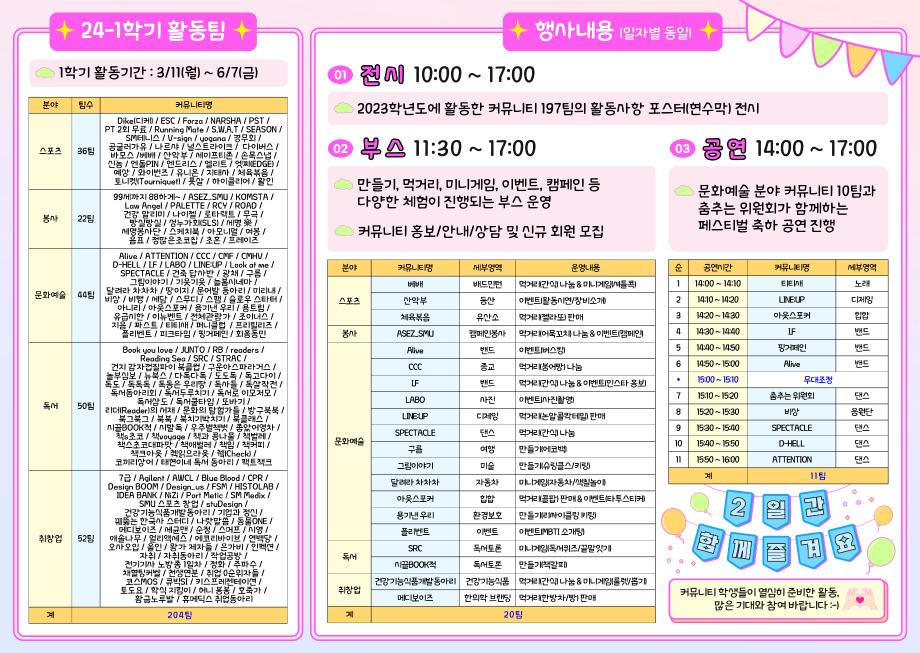 본문 시작 홈으로 공지사항 학생위원회 개요 학생위원회 소개 공지사항 활동결과 홈페이지가이드 프로그램 계획 프로그램 계획 세명대학교 공지사항 프로그램 계획 페이스북 트위터 프린트 [춤추는 위원회] 커뮤니티 페스티벌 축하공연 학생처 1561 2024-04-02 춤추는 위원회에서 제 9회 커뮤니티 페스티벌 축하공연에 참여합니다. 많은 관람 부탁드립니다. 목록 다음 [약속하는 위원회] 2024년도 약속상점 운영안내 다음 [꽃피는 위원회] 벚꽃사진콘테스트 담당부서 : 장학복지팀 담당자 : - 연락처 : 043-649-1142 최종수정일 : 2024-10-26 만족도조사 만족도 조사 이 페이지에서 제공하는 정보에 대하여 만족하시나요? 매우만족 만족 보통 불만족 매우불만족