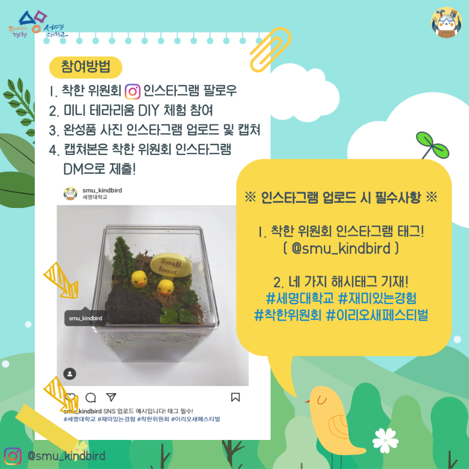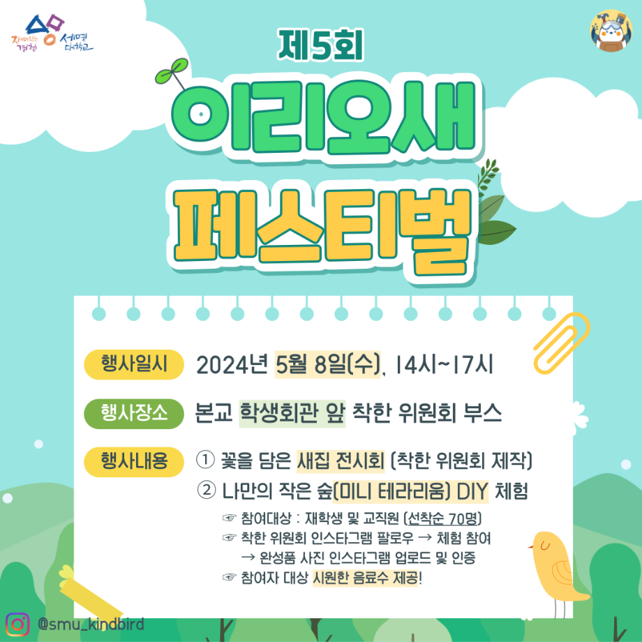 본문 시작 홈으로 공지사항 학생위원회 개요 학생위원회 소개 공지사항 활동결과 홈페이지가이드 프로그램 계획 프로그램 계획 세명대학교 공지사항 프로그램 계획 페이스북 트위터 프린트 [착한 위원회]제5회 이리오새 페스티벌 학생처 1674 2024-05-08 [착한 위원회] 제5회 이리오새 페스티벌 1. 행사일시 : 2024년 5월 8일(수), 14시~17시 2. 행사장소 : 본교 학생회관 앞 착한 위원회 부스 3. 행사내용 - 꽃을 담은 새집 전시회 (착한 위원회 제작) - 나만의 작은 숲(미니 테라리움) DIY 체험 (선착순 70명, 참여자 대상 시원한 음료 제공) 목록 다음 [꽃피는 위원회] 행운을 가져다주는 책갈피 만들기 다음 [생각하는 위원회] 하이드 북 담당부서 : 장학복지팀 담당자 : - 연락처 : 043-649-1142 최종수정일 : 2024-10-26 만족도조사 만족도 조사 이 페이지에서 제공하는 정보에 대하여 만족하시나요? 매우만족 만족 보통 불만족 매우불만족