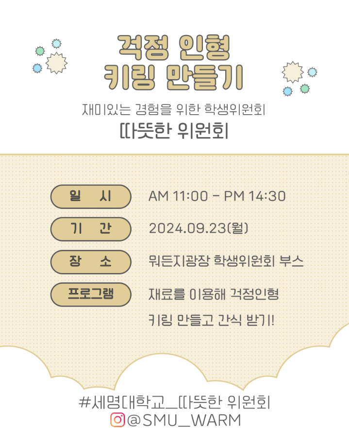 본문 시작 홈으로 공지사항 학생위원회 개요 학생위원회 소개 공지사항 활동결과 홈페이지가이드 프로그램 계획 프로그램 계획 세명대학교 공지사항 프로그램 계획 페이스북 트위터 프린트 [따뜻한 위원회] 걱정인형 키링 만들기 학생처 1010 2024-09-19 [따뜻한 위원회] 걱정인형 키링 만들기 일시 : 2024.09.23(월) 11:00 ~ 14:30 장소 : 뭐든지광장 학생위원회 부스 내용 : '나의 걱정과 불안을 부탁해' 걱정인형 키링 만들기 및 따뜻한 마음이 담긴 간식나눔이벤트 실시 목록 이전[꽃피는 위원회] 비즈반지 만들기 다음 [학생위원회] 제 32대 청룡축전기간 활동 안내 담당부서 : 장학복지팀 담당자 : - 연락처 : 043-649-1142 최종수정일 : 2024-10-26 만족도조사 만족도 조사 이 페이지에서 제공하는 정보에 대하여 만족하시나요? 매우만족 만족 보통 불만족 매우불만족