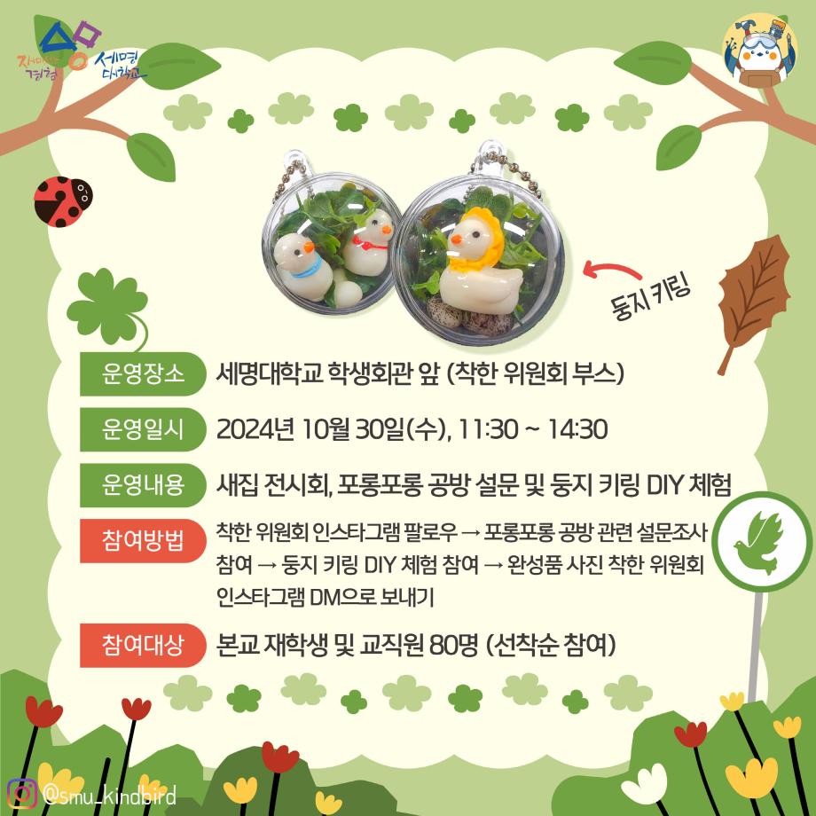 본문 시작 홈으로 공지사항 학생위원회 개요 학생위원회 소개 공지사항 활동결과 홈페이지가이드 프로그램 계획 프로그램 계획 세명대학교 공지사항 프로그램 계획 페이스북 트위터 프린트 [착한 위원회] 포롱포롱 공방의 외출 학생처 1057 2024-10-30 [착한 위원회] 포롱포롱 공방의 외출 1. 행사일시 ■ 2024년 10월 30일(수), 11시 30분~14시 30분 2. 행사장소 ■ 본교 학생회관 앞 착한 위원회 부스 3. 행사내용 ■ 새집 전시회 - 2024학년도 2학기 포롱포롱 공방 활동을 통해 제작한 새집 전시 [2학기 월별(9월~12월) 테마를 담은 새집] ■ 포롱포롱 공방 관련 설문조사 및 둥지 키링 DIY 체험 - 본교 재학생 및 교직원 80명 대상(선착순) 목록 이전[알려주는 위원회] 너의 마음을 알려줘 다음 [통하는 위원회] 추억의 놀이터&문방구 담당부서 : 장학복지팀 담당자 : - 연락처 : 043-649-1142 최종수정일 : 2024-10-26 만족도조사 만족도 조사 이 페이지에서 제공하는 정보에 대하여 만족하시나요? 매우만족 만족 보통 불만족 매우불만족