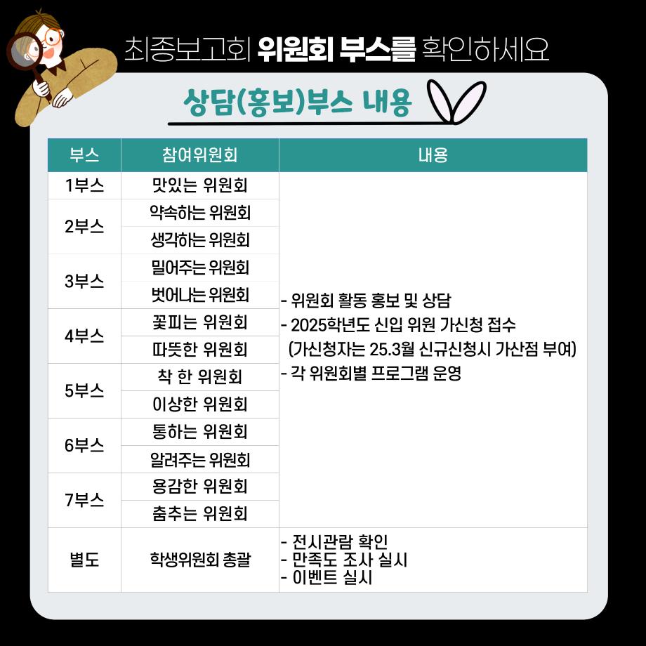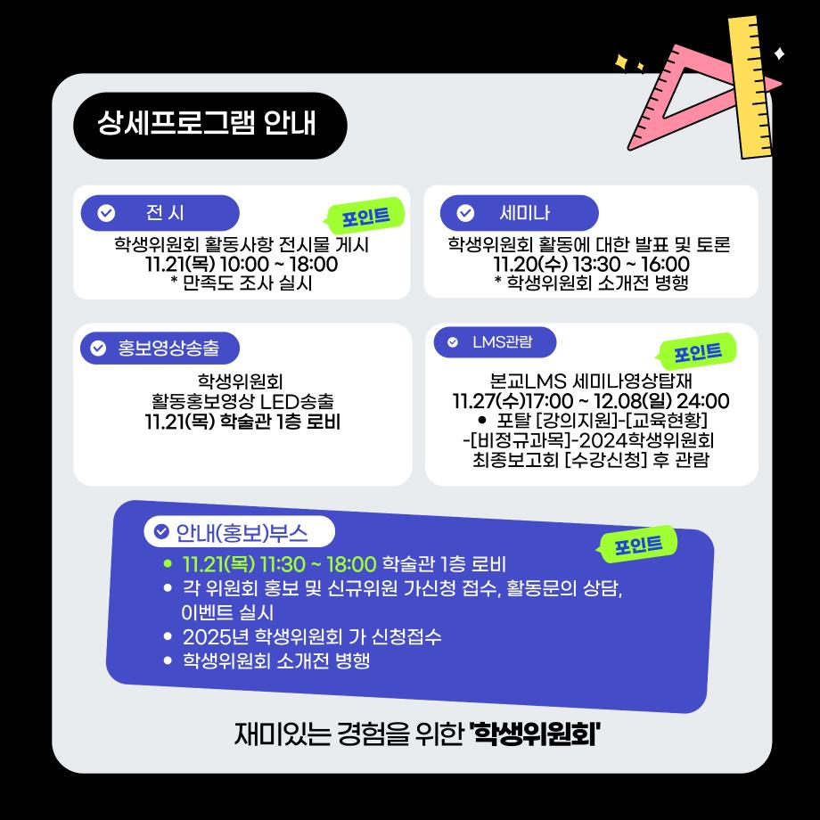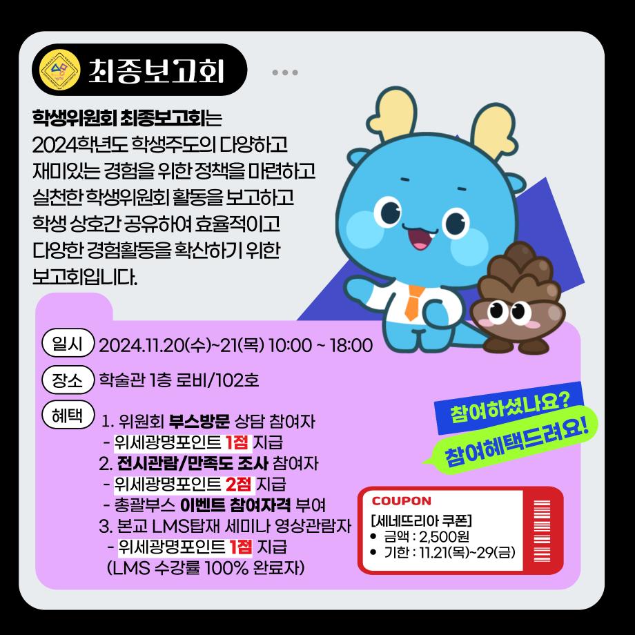 본문 시작 홈으로 공지사항 학생위원회 개요 학생위원회 소개 공지사항 활동결과 홈페이지가이드 프로그램 계획 프로그램 계획 세명대학교 공지사항 프로그램 계획 페이스북 트위터 프린트 학생위원회 최종보고회 학생처 1593 2024-11-20 < 학생위원회 최종보고회 > 일시 : 2024.11.20(수)~21(목) 장소 : 학술관 1층 로비 내용 : 활동실적 발표(세미나), 위원회 소개전, 활동실적 전시(전시), 안내(홍보)부스 진행, 개별 프로그램 진행 목록 이전[이상한 위원회] 이상하거나 '이'상하거나 다음 [따뜻한 위원회] 넌 이름이 뭐니? 담당부서 : 장학복지팀 담당자 : - 연락처 : 043-649-1142 최종수정일 : 2024-10-26 만족도조사 만족도 조사 이 페이지에서 제공하는 정보에 대하여 만족하시나요? 매우만족 만족 보통 불만족 매우불만족