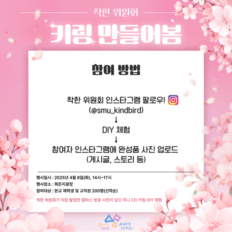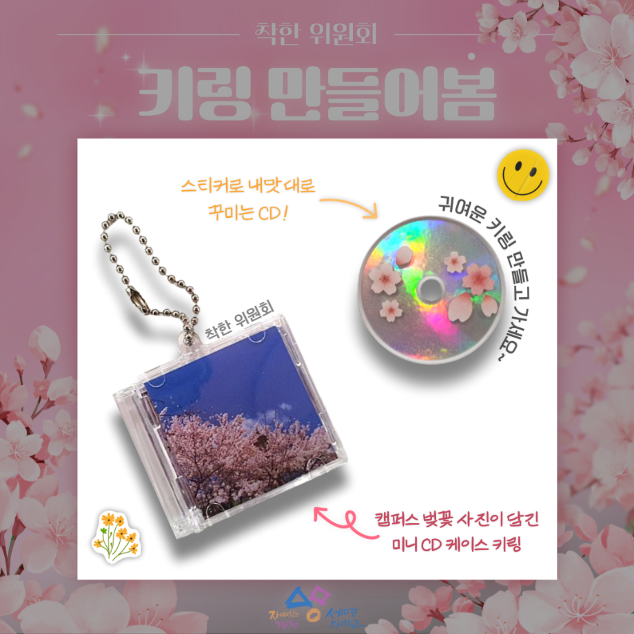 본문 시작 홈으로 공지사항 학생위원회 개요 학생위원회 소개 공지사항 활동결과 홈페이지가이드 프로그램 계획 프로그램 계획 세명대학교 공지사항 프로그램 계획 페이스북 트위터 프린트 [착한 위원회] 키링만들어봄 학생처 765 2025-04-08 [착한 위원회] 키링 만들어봄 1. 행사일시 ■ 2025년 4월 8일(화), 14시~17시 2. 행사장소 ■ 본교 뭐든지광장 3. 행사내용 ■ 착한 위원회가 직접 촬영한 캠퍼스 벚꽃 사진이 담긴 미니 CD 키링 DIY 체험 ■ 본교 재학생 및 교직원 200명 대상(선착순) 목록 이전[맛있는 위원회]맛있나봄 다음 [이상한 위원회]🌸이상한 위원회 벚꽃 포토존 홍보🌸 담당부서 : 장학복지팀 담당자 : - 연락처 : 043-649-1142 최종수정일 : 2024-10-26 만족도조사 만족도 조사 이 페이지에서 제공하는 정보에 대하여 만족하시나요? 매우만족 만족 보통 불만족 매우불만족
