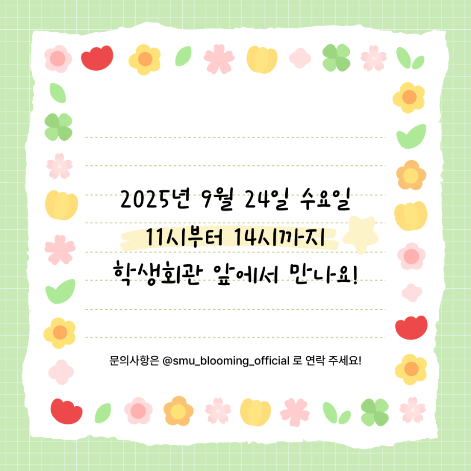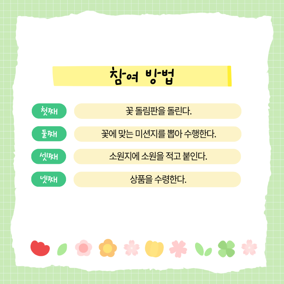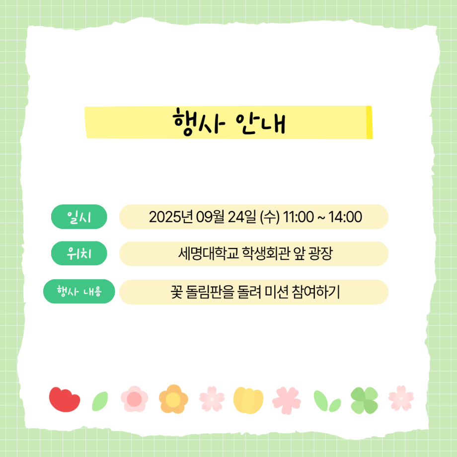 본문 시작 홈으로 공지사항 학생위원회 개요 학생위원회 소개 공지사항 활동결과 홈페이지가이드 프로그램 계획 프로그램 계획 세명대학교 공지사항 프로그램 계획 페이스북 트위터 프린트 [꽃피는 위원회] 꽃 돌려라 피어라! 학생처 137 2025-09-24 < 꽃피는 위원회 청룡체전기간 행사 안내 > 1. 행사명: 꽃 돌려라 피어라 2. 일시: 2025.9..24(수) 11:00~14:00 3. 장소: 학생회관 앞 광장 학생위원회 부스 4. 참여방법 - 꽃 돌림판을 돌린다 - 나온 꽃에 맞는 미션지를 뽑아 수행한다 - 소원지에 소원을 붙인다 - 상품을 수령한다 5. 상품: 이온음료 등 소소한 미션도 즐기고 소원도 남기며 즐거운 시간을 보내세요 학우 여러분의 많은 관심과 참여 부탁드립니다. 목록 이전[학생위원회] 청룡체전기간 학생위원회 전체활동안내 다음 [용감한 창업자] 어떤 향이 좋아? 담당부서 : 장학복지팀 담당자 : - 연락처 : 043-649-1142 최종수정일 : 2024-10-26 만족도조사 만족도 조사 이 페이지에서 제공하는 정보에 대하여 만족하시나요? 매우만족 만족 보통 불만족 매우불만족