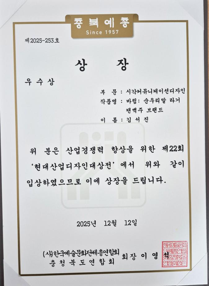 본문 시작 홈으로 학과자랑 학과소개 학과과정 시영소식 입학/취업 AI 학과자랑 SNS소통 홈페이지가이드 학과자랑 학과자랑 학과갤러리 동아리 졸업전시회 학과자랑 페이스북 트위터 프린트 제22회 현대산업디자인대상전 - 우수상, 특선 등 수상! 시각영상디자인학과 26 2025-12-26 우수상 1작, 특선 3작, 입선 다수 등 수상하였습니다 목록 이전2025 국제 사이버디자인 트렌드공모전 -본상 수상! 담당부서 : 시각영상디자인학과 담당자 : - 연락처 : 043-649-1726 최종수정일 : 2024-10-26 만족도조사 만족도 조사 이 페이지에서 제공하는 정보에 대하여 만족하시나요? 매우만족 만족 보통 불만족 매우불만족