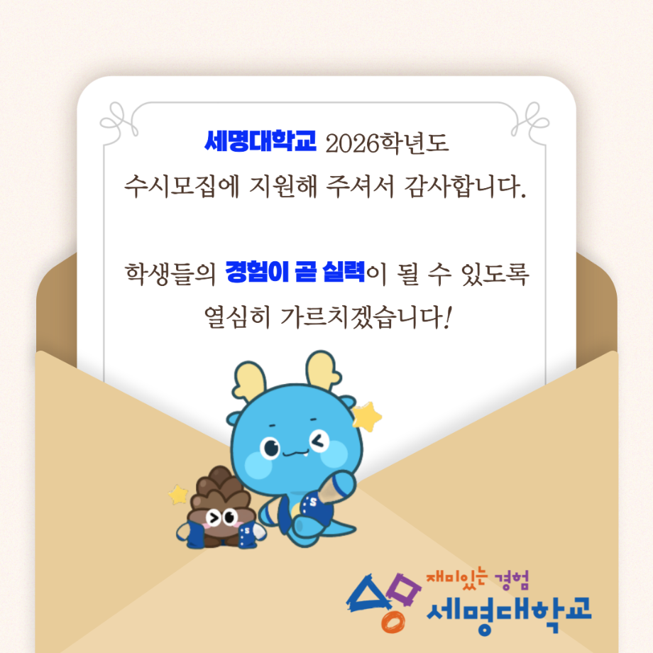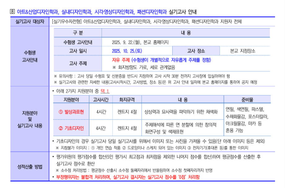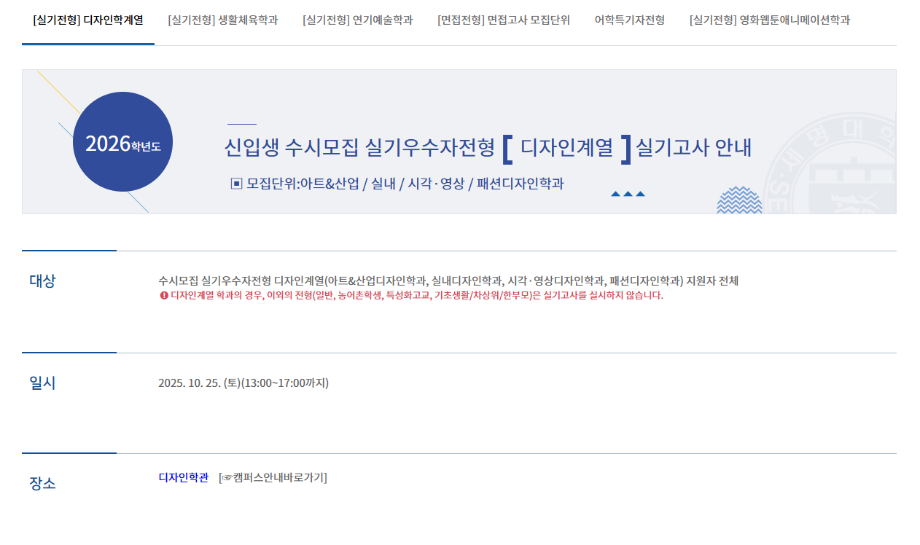 본문 시작 홈으로 입학/AI 학과소개 학과과정 시영소식 입학/AI 학과자랑 SNS소통 홈페이지가이드 입학여기 입학여기 디자인 정보 AI 콘텐츠 연구소(AI 디자인) 입학여기 페이스북 트위터 프린트 2026 수시모집 디자인계열학과 실기고사 안내 - 시각영상디자인학과 시각영상디자인학과 121 2025-10-01 2026 수시모집 디자인계열학과 실기고사 안내- 시각영상디자인학과 실기고사 안내 바로가기 > https://www.semyung.ac.kr/ipsi/sub01_07_03.do 목록 이전8월 12일 -중고등학생 대상 취업 특강- AI 브랜딩 만족도조사 만족도 조사 이 페이지에서 제공하는 정보에 대하여 만족하시나요? 매우만족 만족 보통 불만족 매우불만족