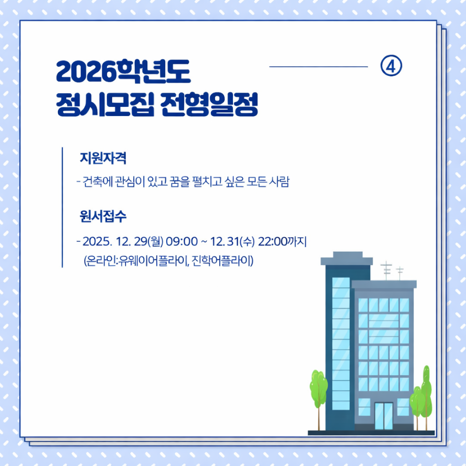 본문 시작 홈으로 커뮤니티 학과소개 교수소개 교육과정 학과 행사 및 활동 커뮤니티 홈페이지가이드 열린정보 학과일정 학과공지 채용정보 및 자료 열린정보 포토갤러리 먹거리, 즐길거리 포토갤러리 사진 사진 영상 사진 페이스북 트위터 프린트 사진 영상 [ 건축학과] 2026학년도 정시 원서접수(12.29~31) 건축학과 23 2025-12-30 목록 이전[2026 정시] 모집 안내 만족도조사 만족도 조사 이 페이지에서 제공하는 정보에 대하여 만족하시나요? 매우만족 만족 보통 불만족 매우불만족